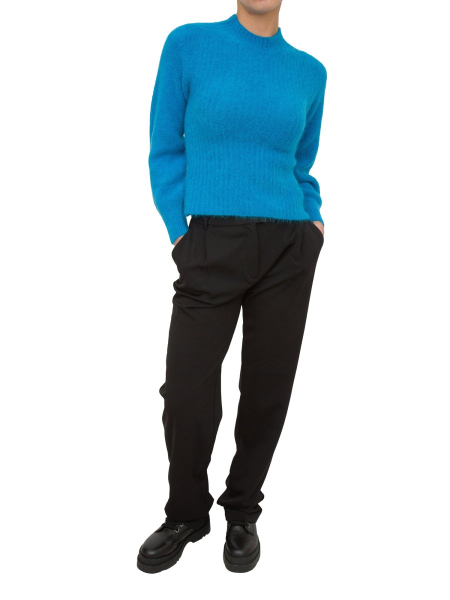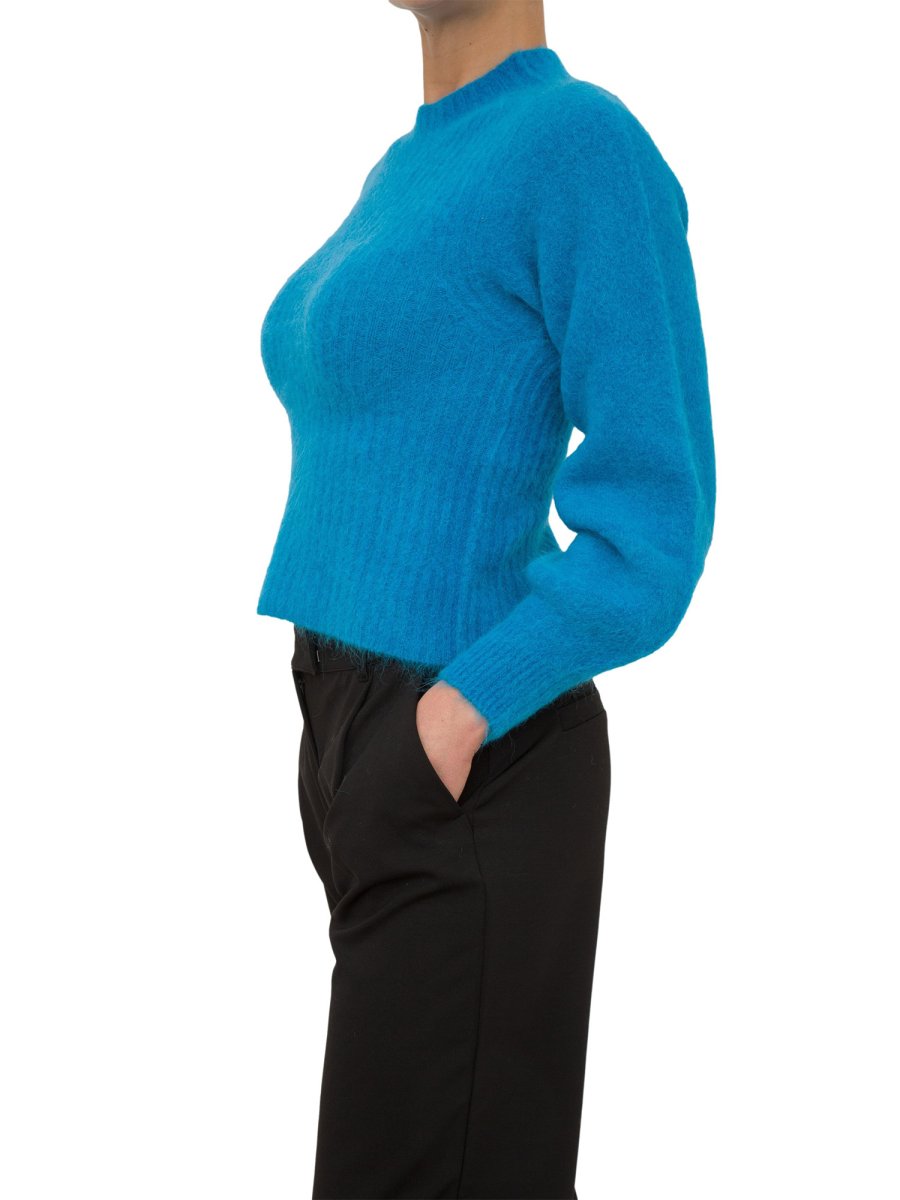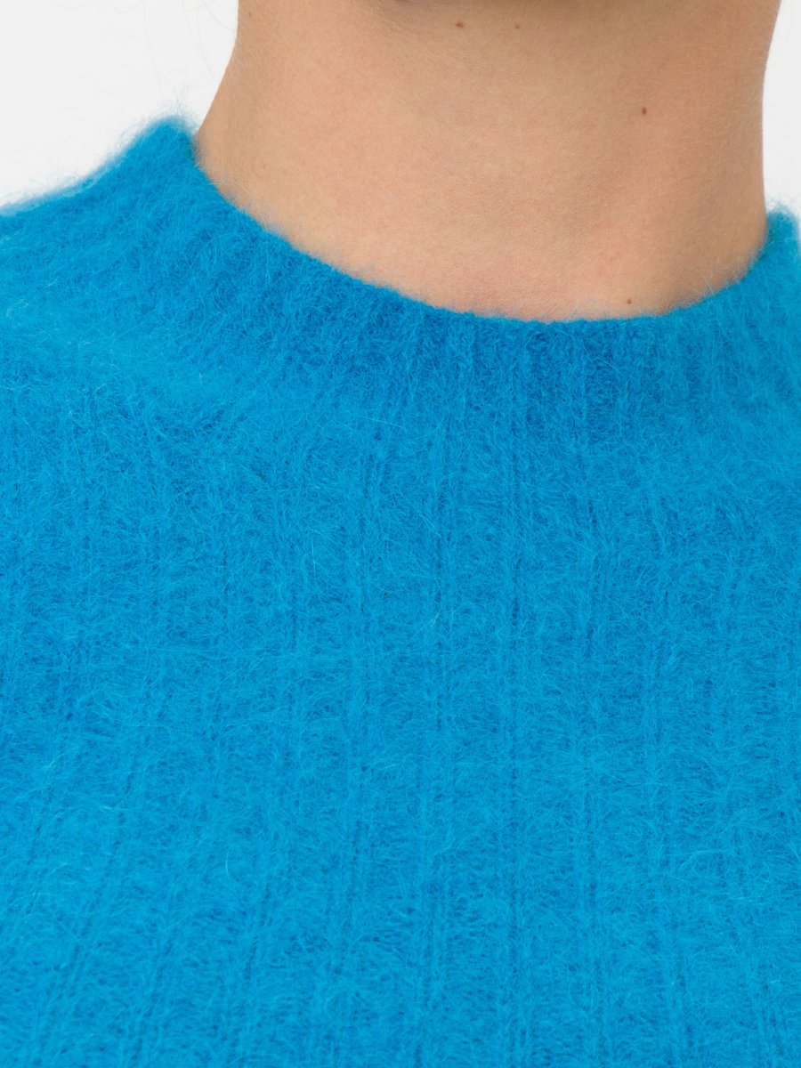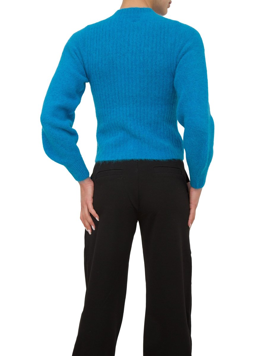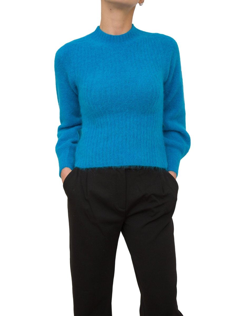 Maglia in misto alpaca, linea dritta con fronte e retro a coste. Collo alto, maniche ampie con polsino a coste.