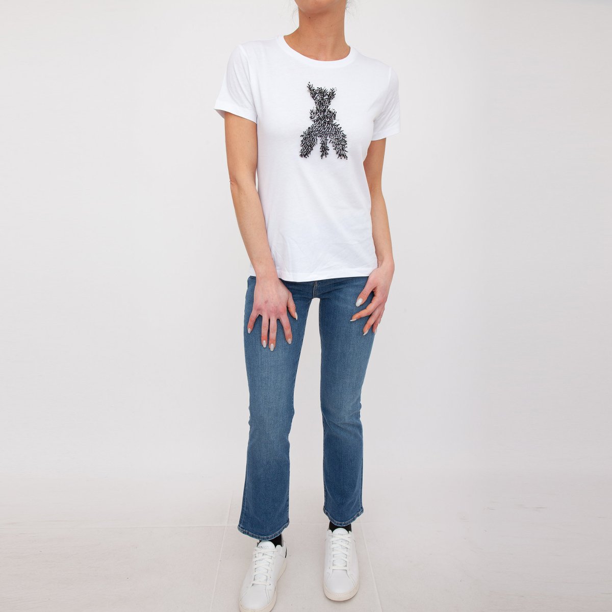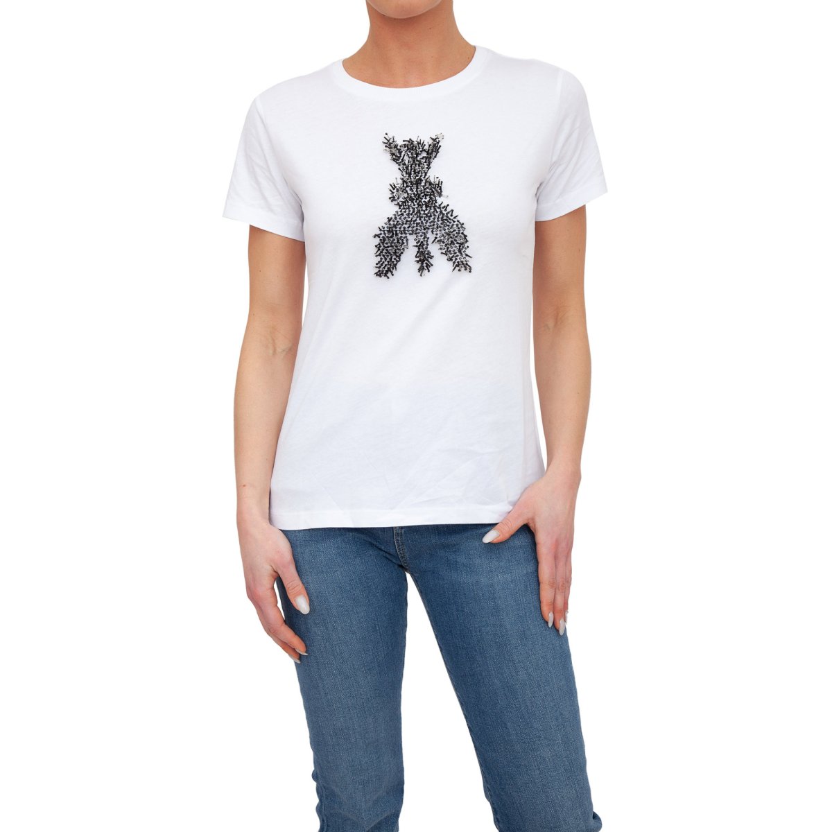 T-shirt Patrizia Pepe, in jersey di puro cotone, vestibilità regolare, manica corta, scollo tondo, ricamo a mano fly di baguette e perline e stampa PP.