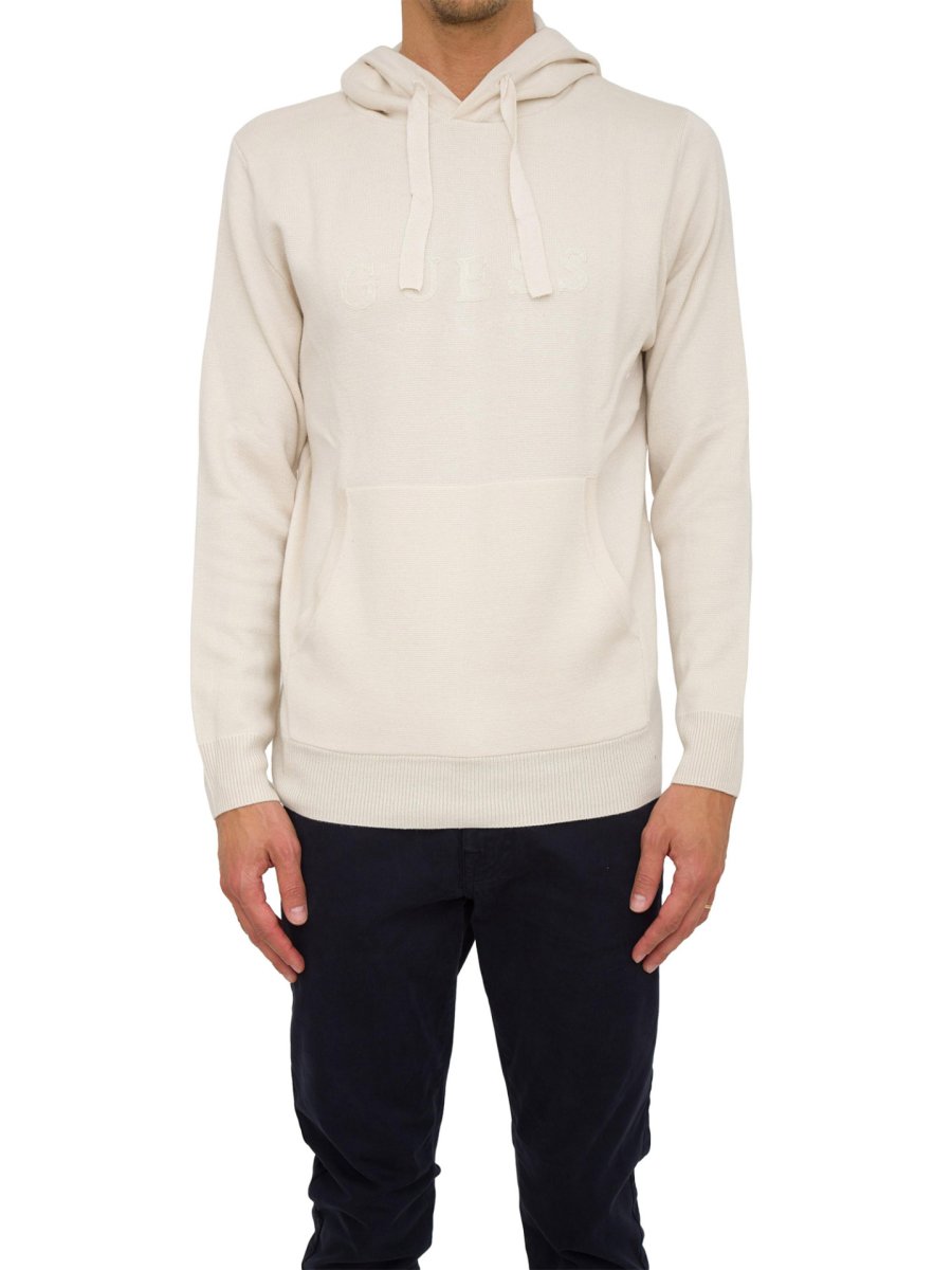 Maglia da uomo con cappuccio Guess Jeans, stile felpa, realizzata in materiale sintetico, maniche lunghe e tasca a marsupio sul davanti.