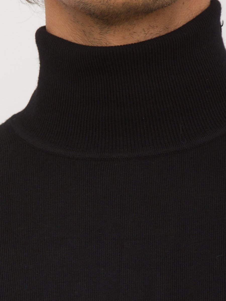 Светр з високим коміром стандартної посадки. Виконаний із суміші вовни та кашеміру. Доступний в однотонному кольорі, має ребристу в'язку на манжетах, подолі та комірі. Завершує дизайн металеву пластину, нанесену на спинку.