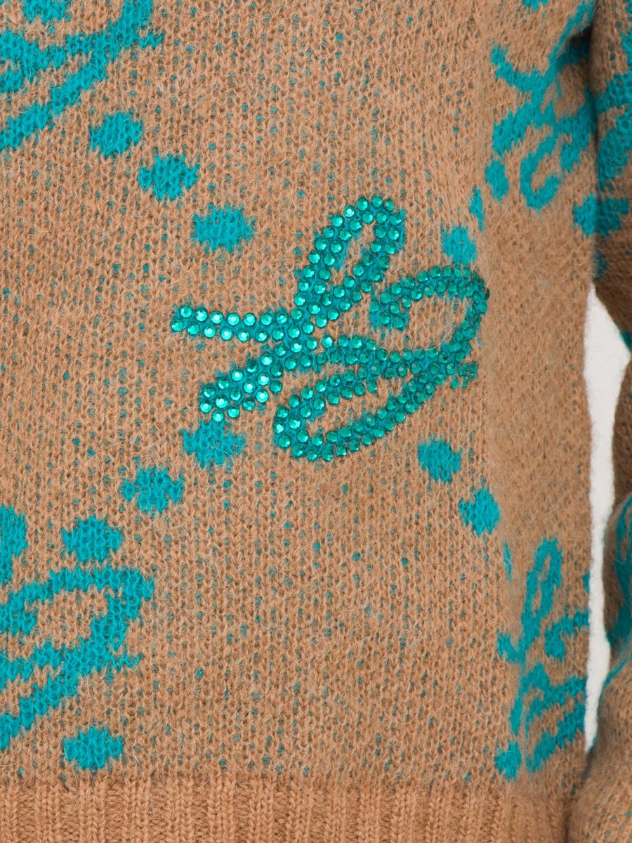 Maglia da donna Liu-Jo realizzata in misto alpaca, interventi in lurex®, motivo a rombi con logo jacquard, strass applicati, scollo a V, maniche lunghe, logo in metallo sul retro e bordi rifiniti a coste. Made in Italy.