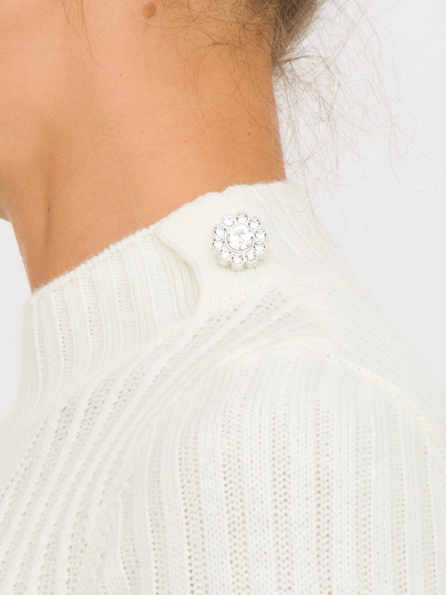 Maglia da donna Liu-Jo realizzata in misto lana, lavorazione a coste e a trecce, bottone gioiello, collo lupetto, maniche lunghe e logo in metallo sul retro.