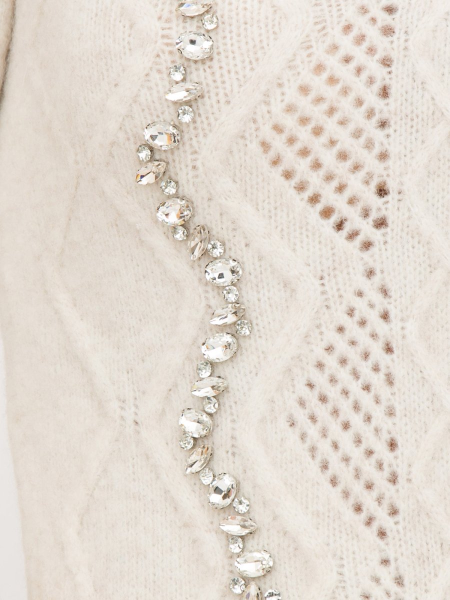 Pullover donna Liu-Jo in misto lana stretch, trama grafica sul davanti, lavorazione a costa inglese sul retro, applicazioni gioiello, collo a revers, maniche lunghe e bordi rifiniti a coste.