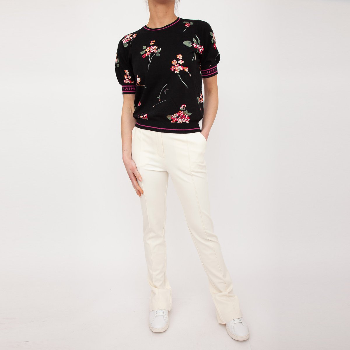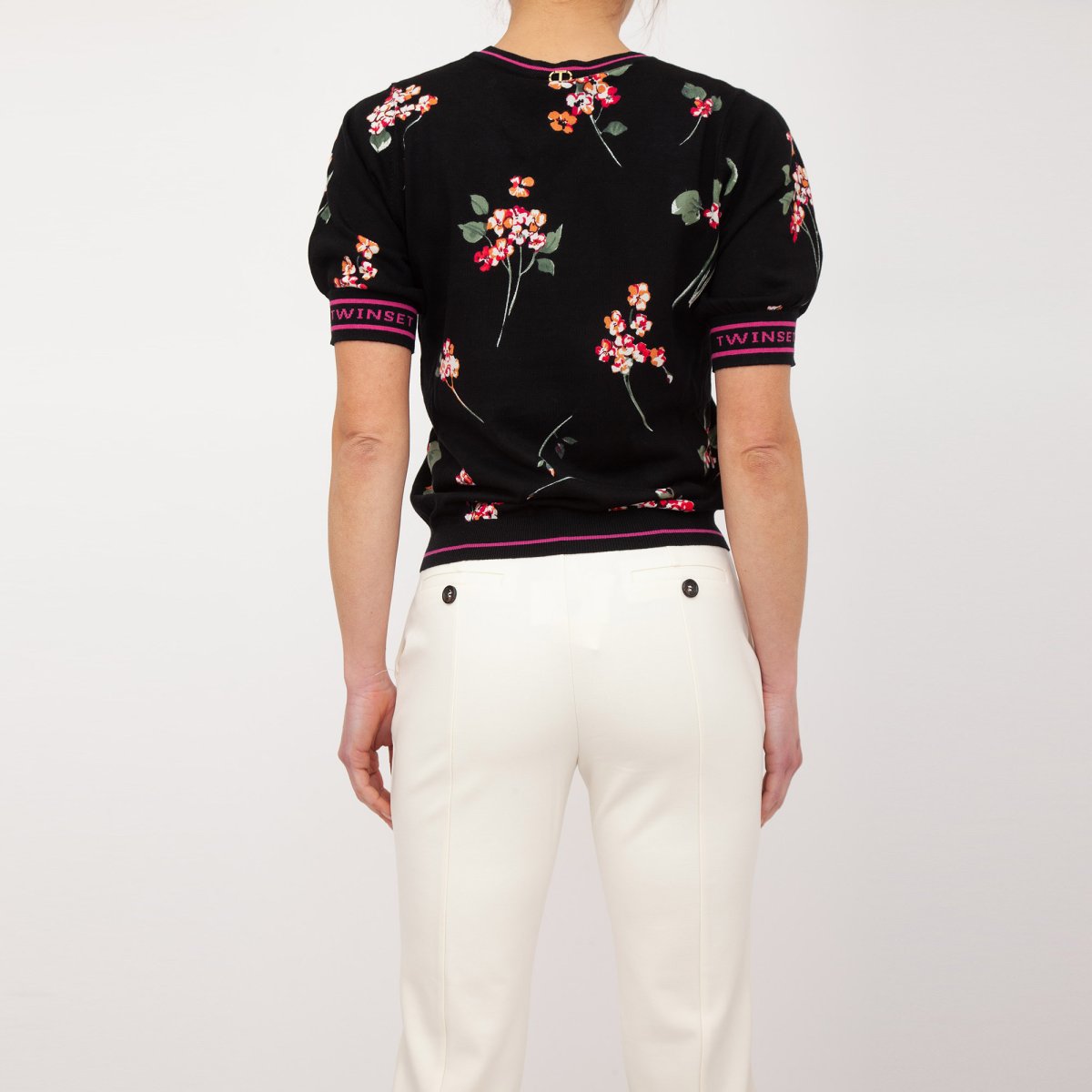Maglia in misto cotone e viscosa stampata con scritta logo jacquard a contrasto, collo tondo, maniche corte, linea regular.