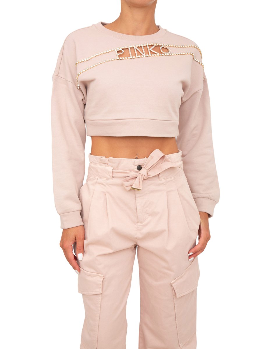 Felpa corta Pinko in morbido cotone con dettaglio logato con strass applicati davanti. Scollo tondo e maniche lunghe a giro leggermente basso dal volume ampio.
