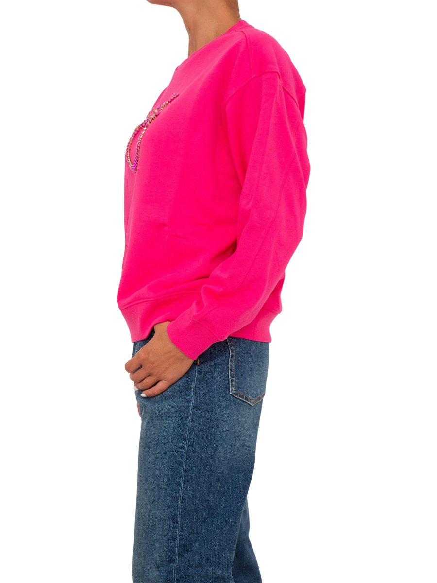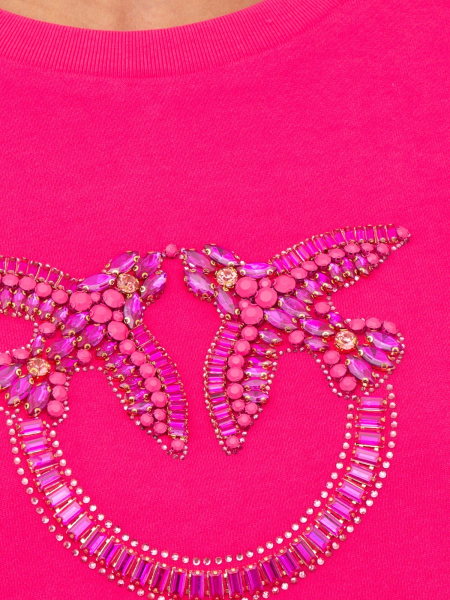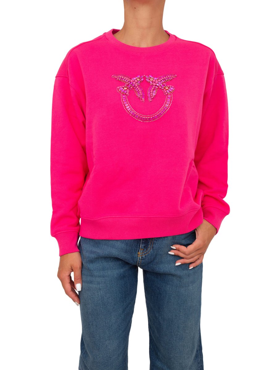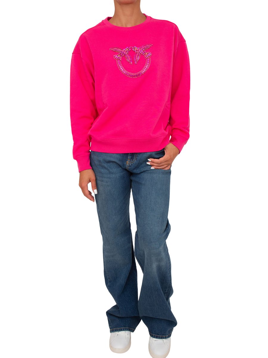 Felpa Pinko a maniche lunghe in morbido cotone con maxi ricamo gioiello Love Birds davanti. Scollo tondo, polsini e fondo capo con elastico.