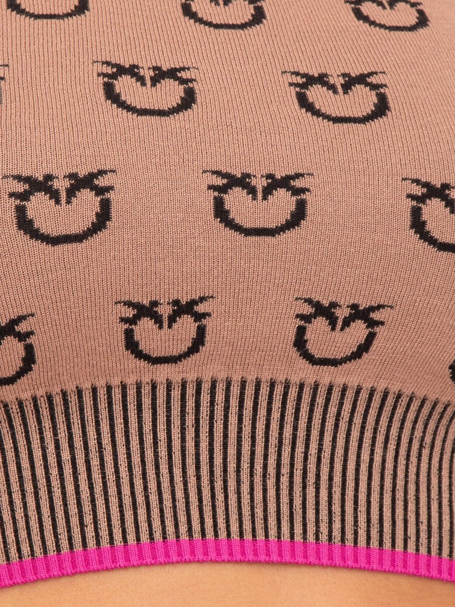 Maglioncino pinko corto dalla linea aderente in maglia di misto lana jacquard con disegno logo Love Birds. Scollo tondo, polsino e fondo capo lavorati a costine.