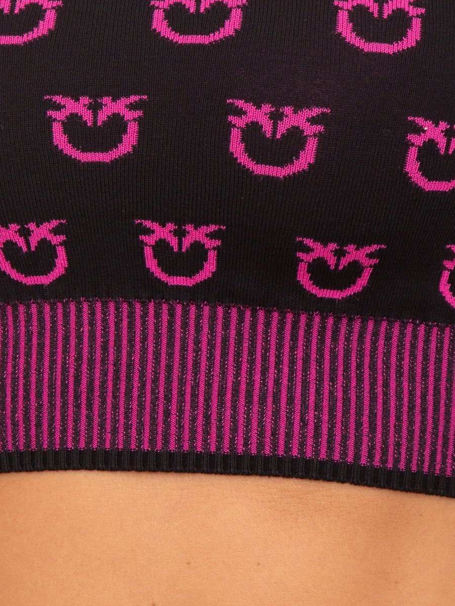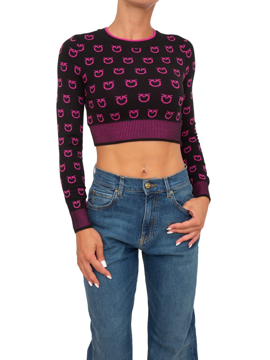 Maglioncino pinko corto dalla linea aderente in maglia di misto lana jacquard con disegno logo Love Birds. Scollo tondo, polsino e fondo capo lavorati a costine.