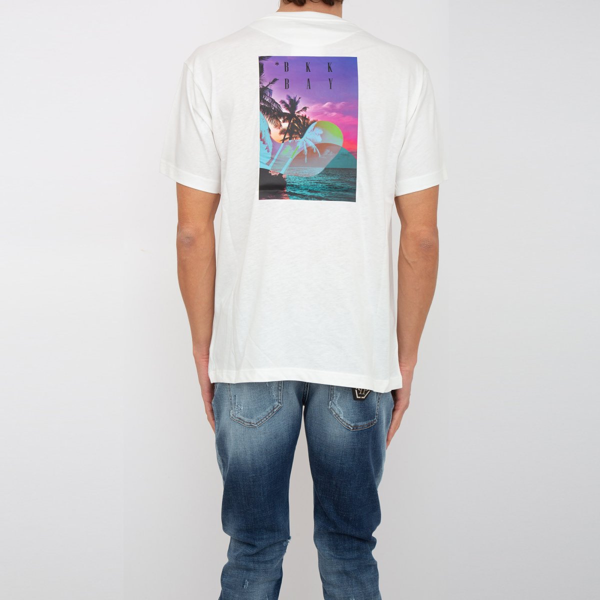 Realizzata in jersey di cotone, questa accattivante T-shirt da uomo è caratterizzata dalle stampe posizionate sul petto e sulla schiena, raffiguranti il logo e uno scenario tropicale da sogno. La maglietta presenta maniche corte e fondo dritto.