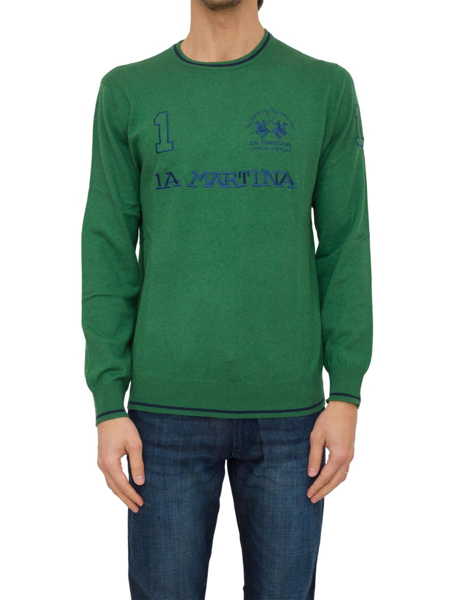 Maglia a girocollo della linea Iconos è realizzata in morbido cotone e lana, ed è disponibile in diversi colori. Ha maniche lunghe e presenta una linea in contrasto sul girocollo, girovita e polsini. La maglia è decorata con la grande scritta "La Martina" sul davanti e diverse stampe con logo in vari punti.
