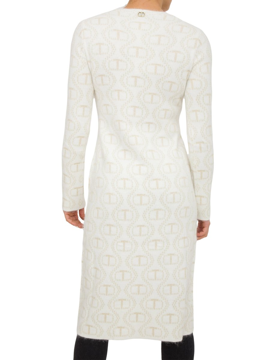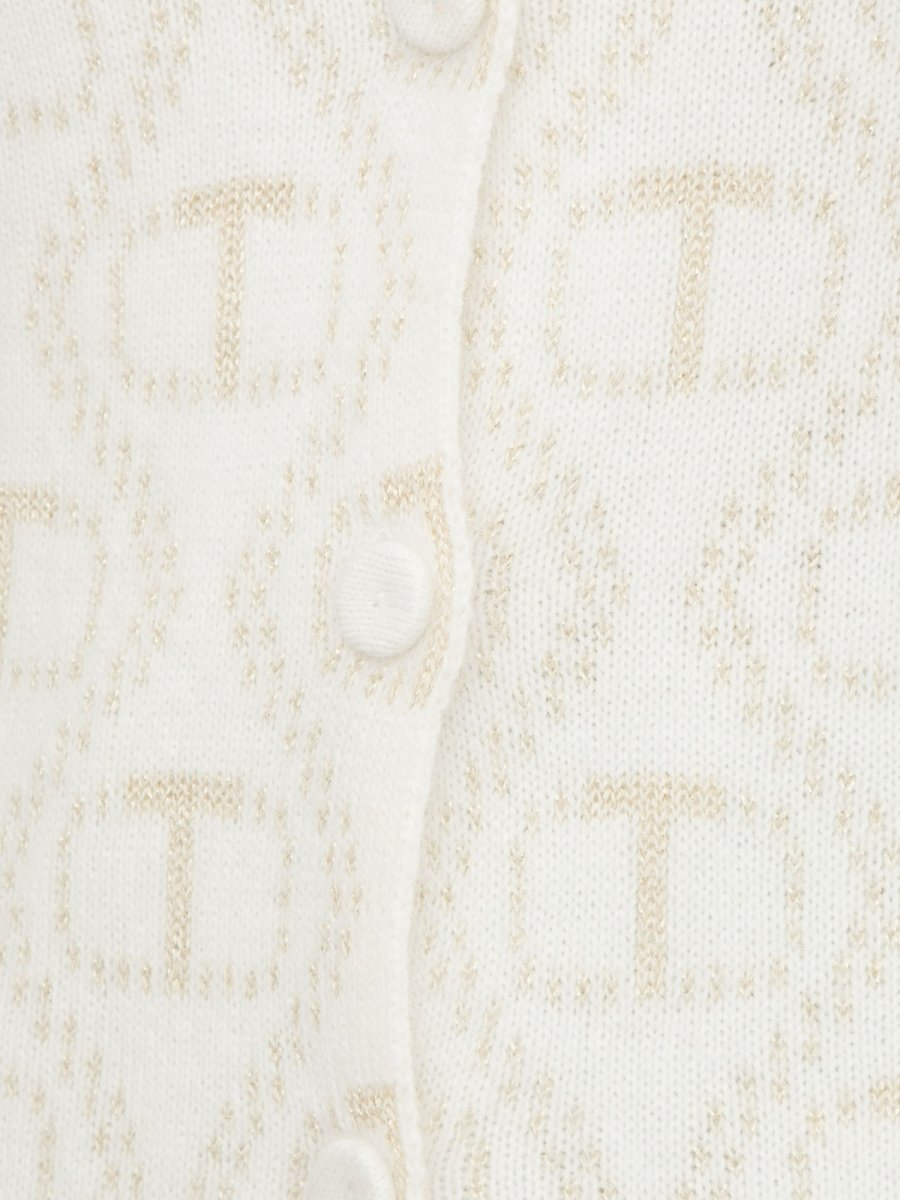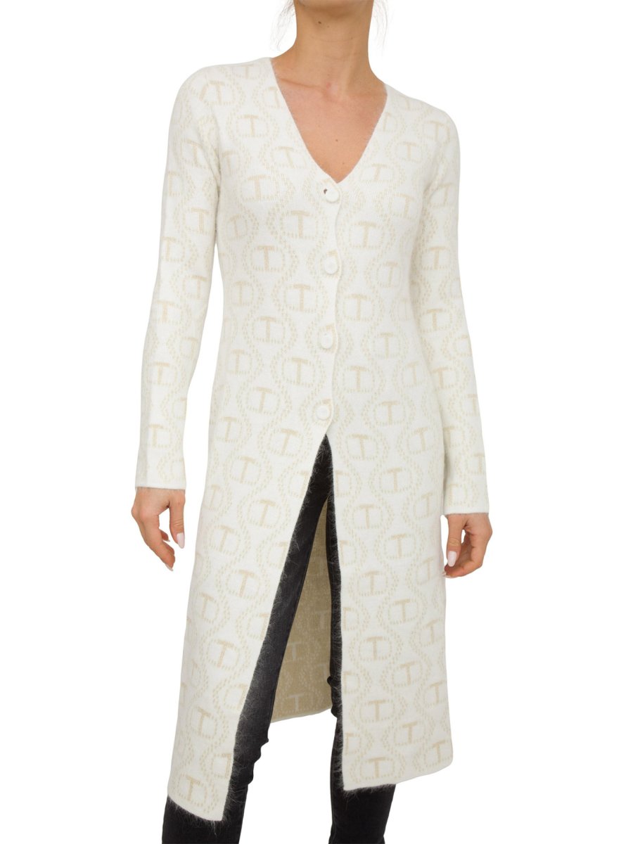Cardigan lungo da donna Twinset in misto angora e lurex jacquard con logo Oval T, scollo a V, maniche lunghe, bottoni a pressione.