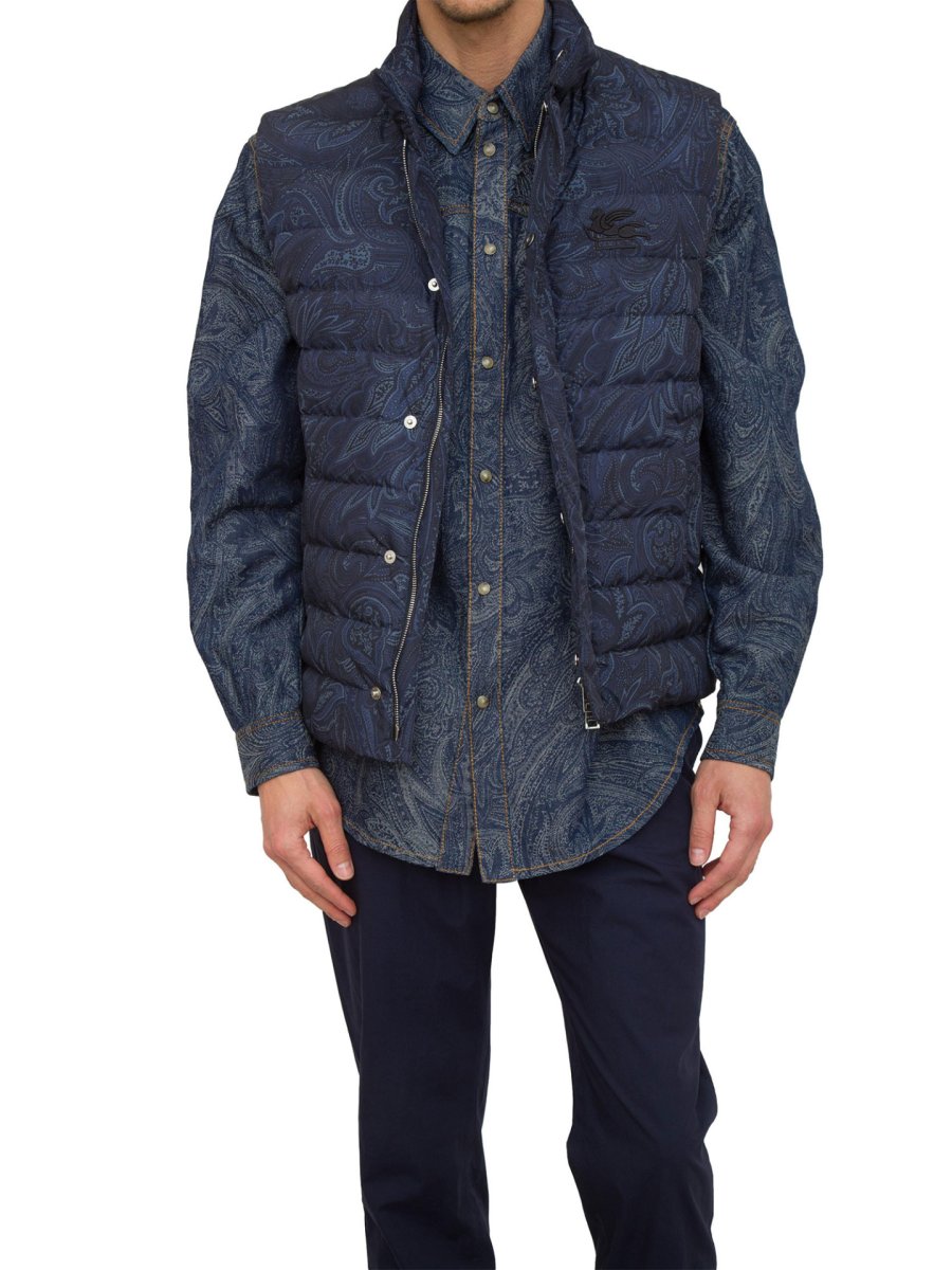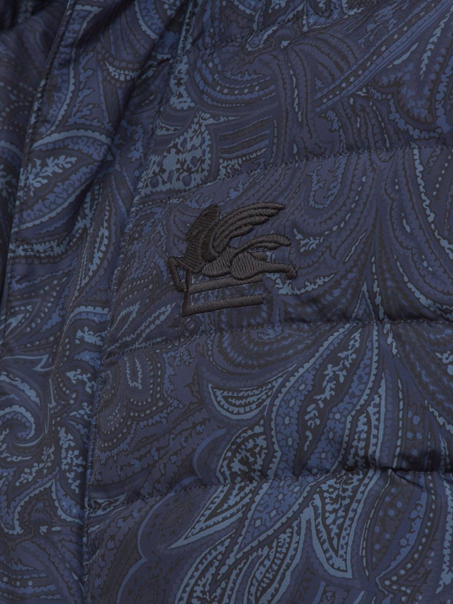 Gilet Etro con stampa paisley con imbottitura in piuma d'oca, logo ricamato sul petto e chiusura frontale con bottoni a pressione e zip.