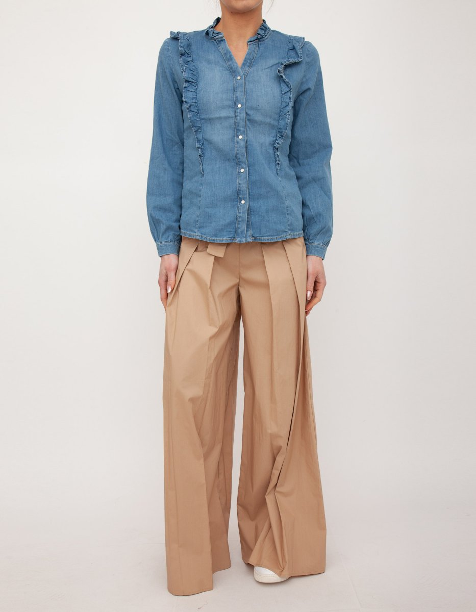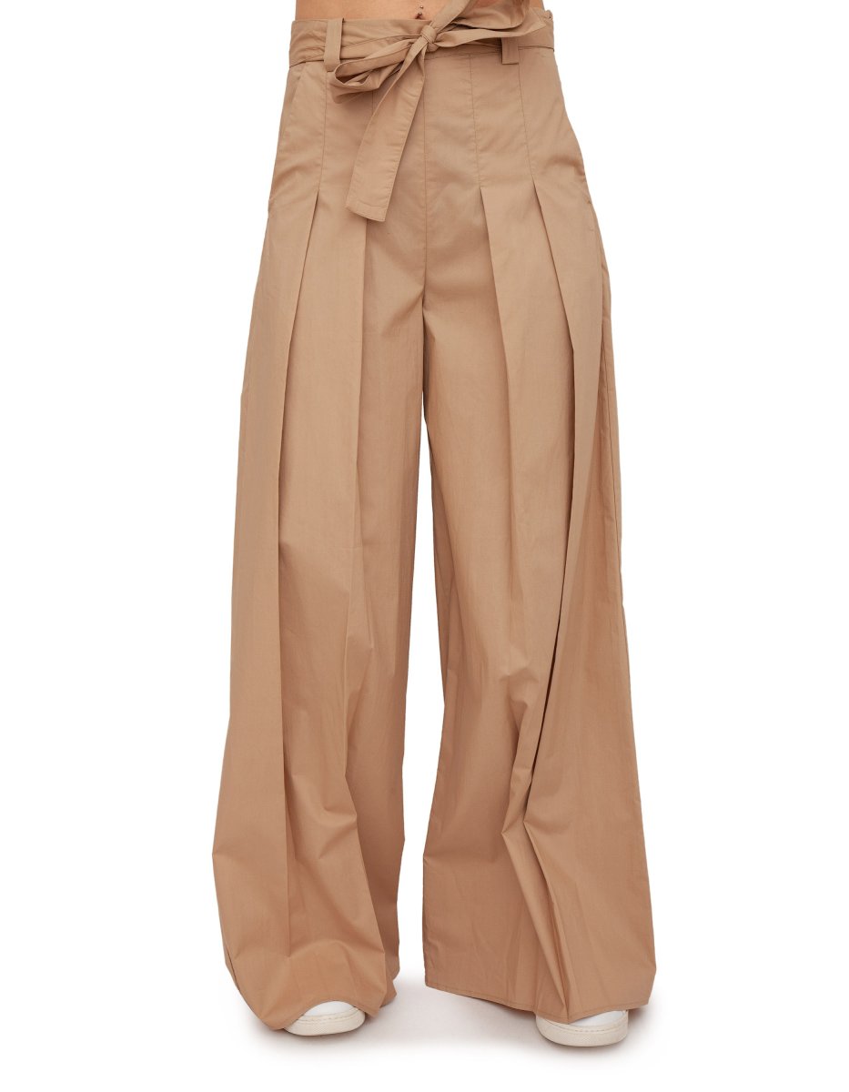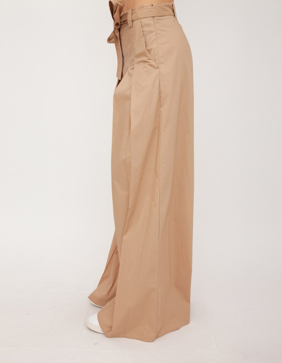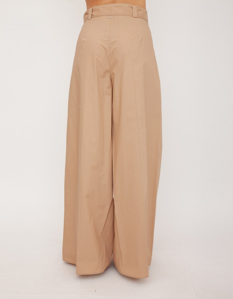 Pantalone LIU JO in cotone tinta unita, vita alta con cinturino dello stesso tessuto da annodare. Pences lungo le gambe che creano pieghe. Gamba larga.