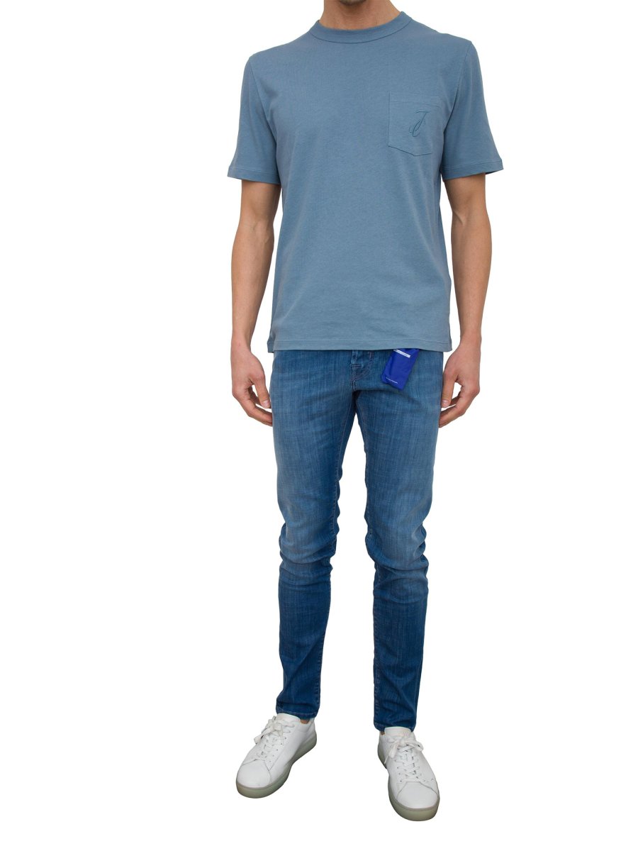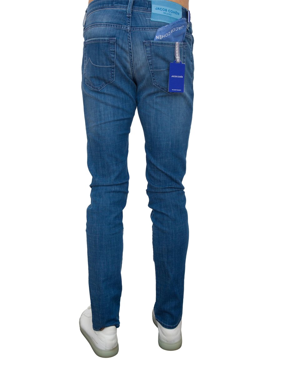 Чоловічі джинси з п'ятьма кишенями Jacob Cohen, модель вузького крою із заниженою талією, виготовлені із супереластичної м'якої віскози синього кольору, бавовни та ліоцелу, обробленого ензимним пранням, ручної піскоструминної обробки та м'якої текстури.