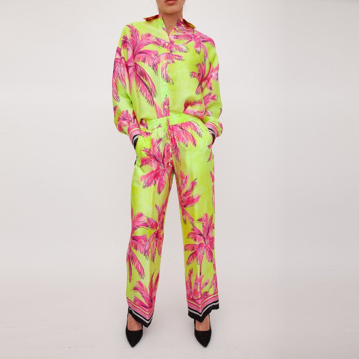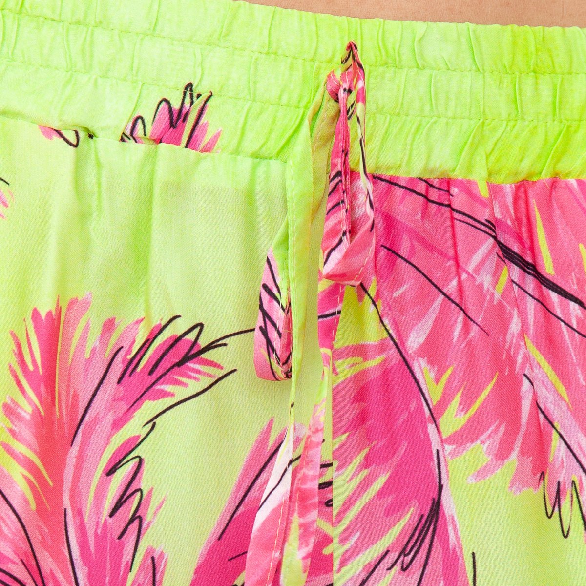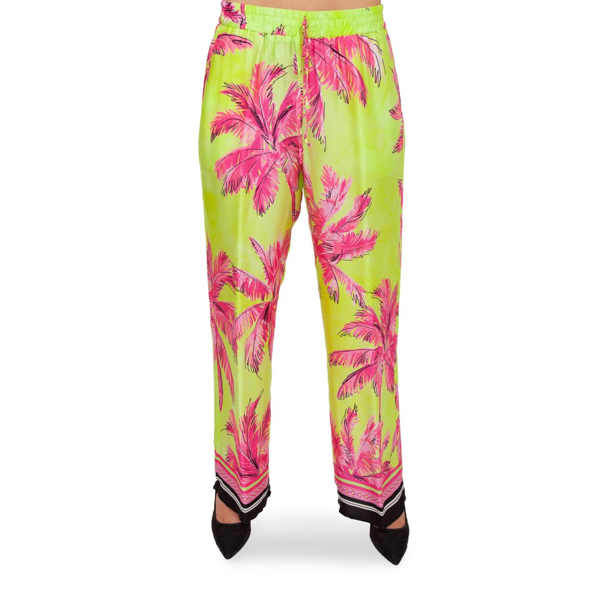 Pantaloni a gamba larga con stampa floreale, elastico in vita con coulisse due tasche laterali a fessura e bordo a strisce.