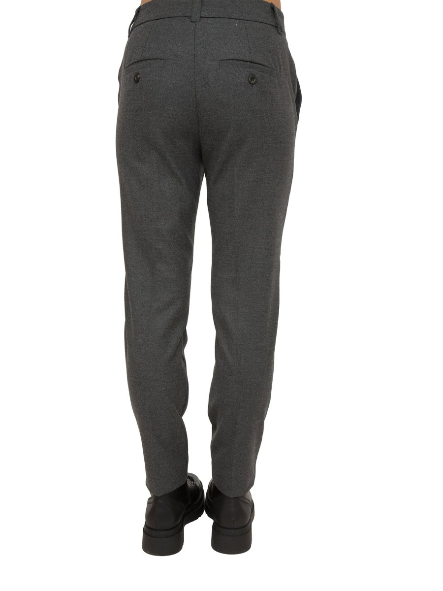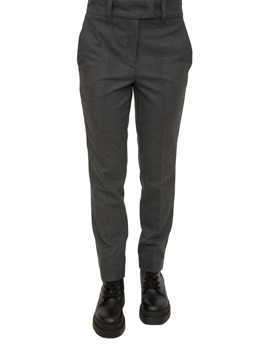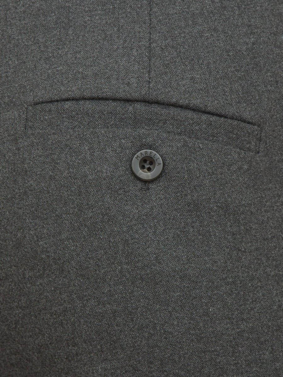 Pantaloni in flanella stretch, linea dritta. Chiusura con gancio e zip nascosti, tasche alla francese davanti, a filetto dietro. Piega stirata fronte e retro.