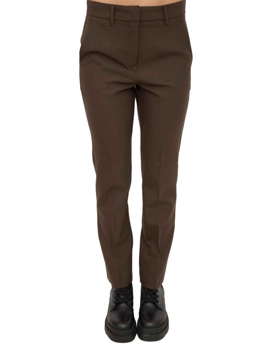 Pantaloni in saglia misto lana stretch, linea straight leg. Chiusura con gancio e zip nascosti, tasche alla francese davanti, a filetto dietro. Piega stirata fronte e retro.