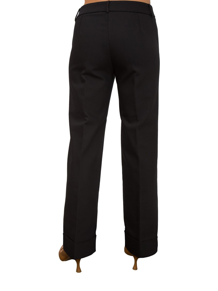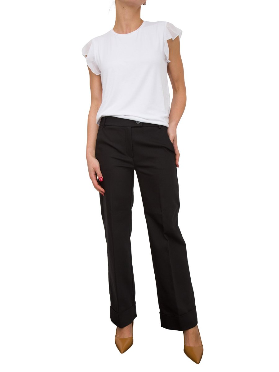 Pantaloni in misto cotone stretch, linea dritta con risvolto, chiusura con bottone e zip nascosta, tasche alla francese e piega stirata fronte e retro.