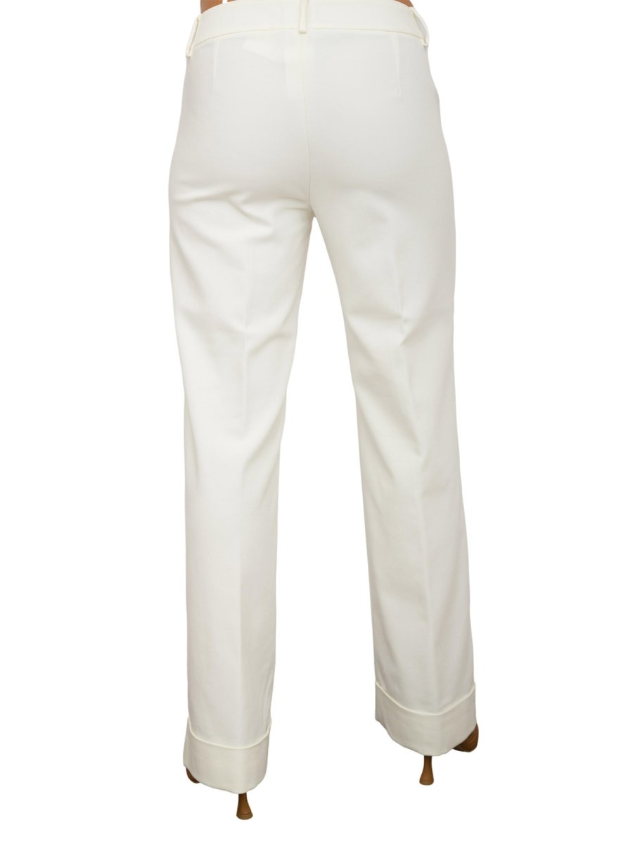 Pantaloni in misto cotone stretch, linea dritta con risvolto, chiusura con bottone e zip nascosta, tasche alla francese e piega stirata fronte e retro.