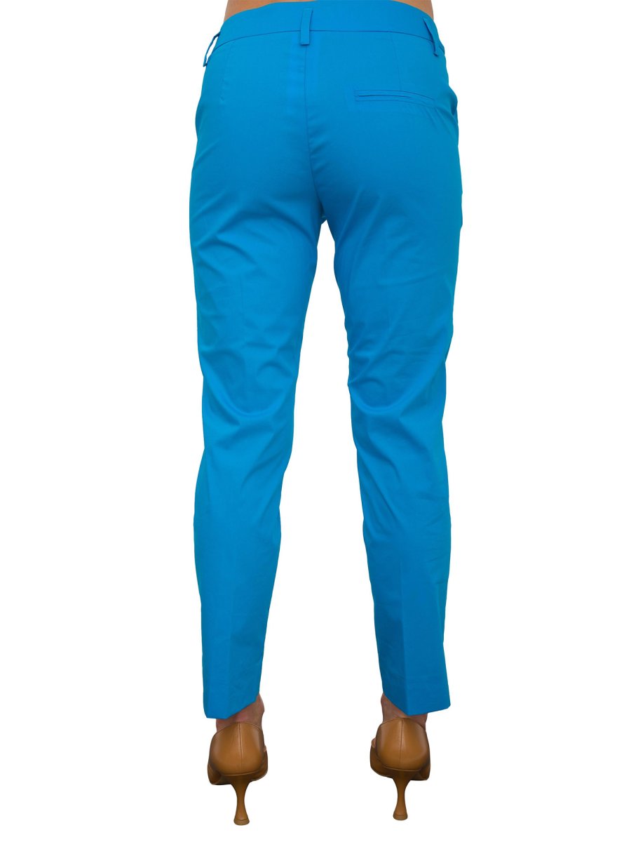 Pantaloni in popeline leggero stretch, linea chino, vita bassa, chiusura con bottone e zip nascosta, tasche alla francese davanti, singola a filetto dietro e piega stirata fronte e retro.