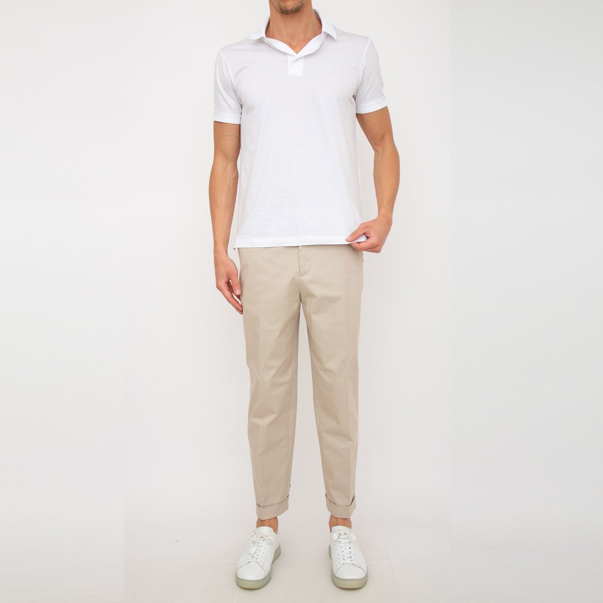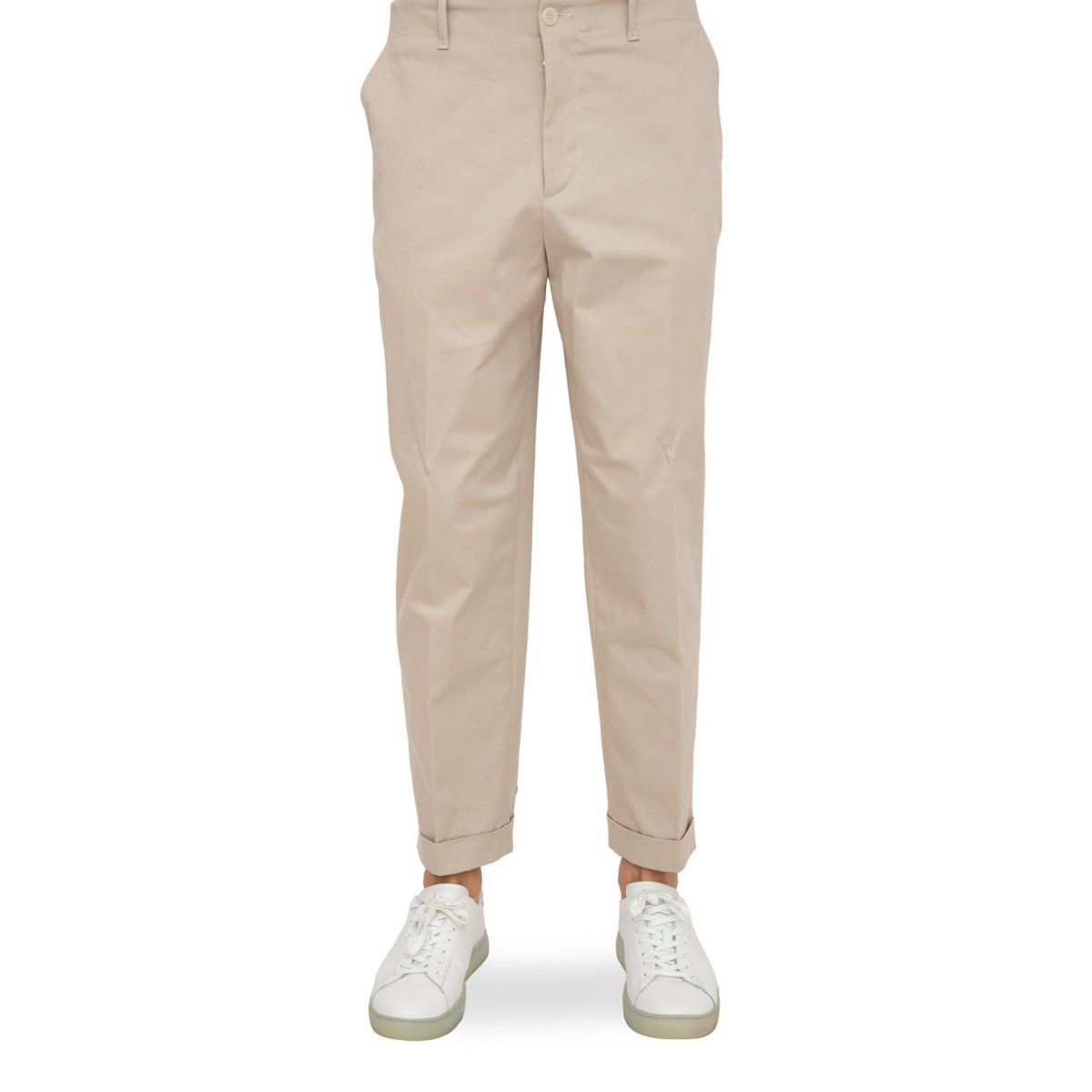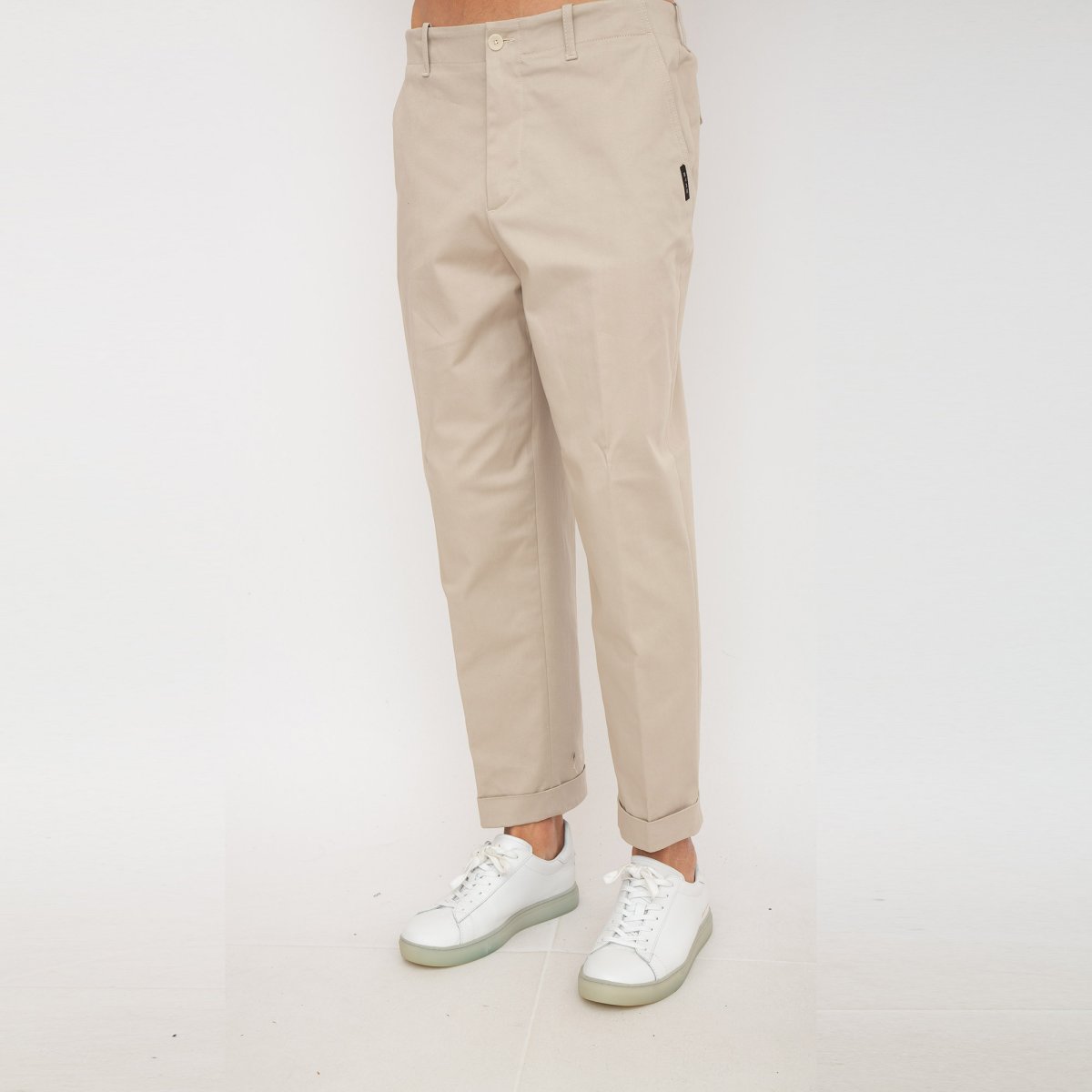 Pantaloni sartoriali gabardina di cotone stretch, caratterizzati da risvolto al fondo.