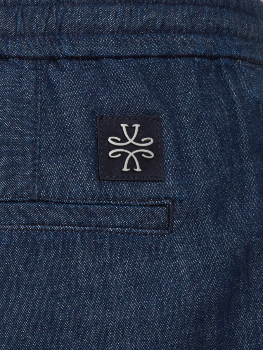 Чоловічі штани Jacob Cohen з бавовняного попліну з бічними кишенями і прорізними задніми кишенями. Модель приталеного крою із звичайною талією, заниженим кроковим швом та зав'язкою для більшого комфорту, із замшевою етикеткою та логотипом із нікельованого металу.