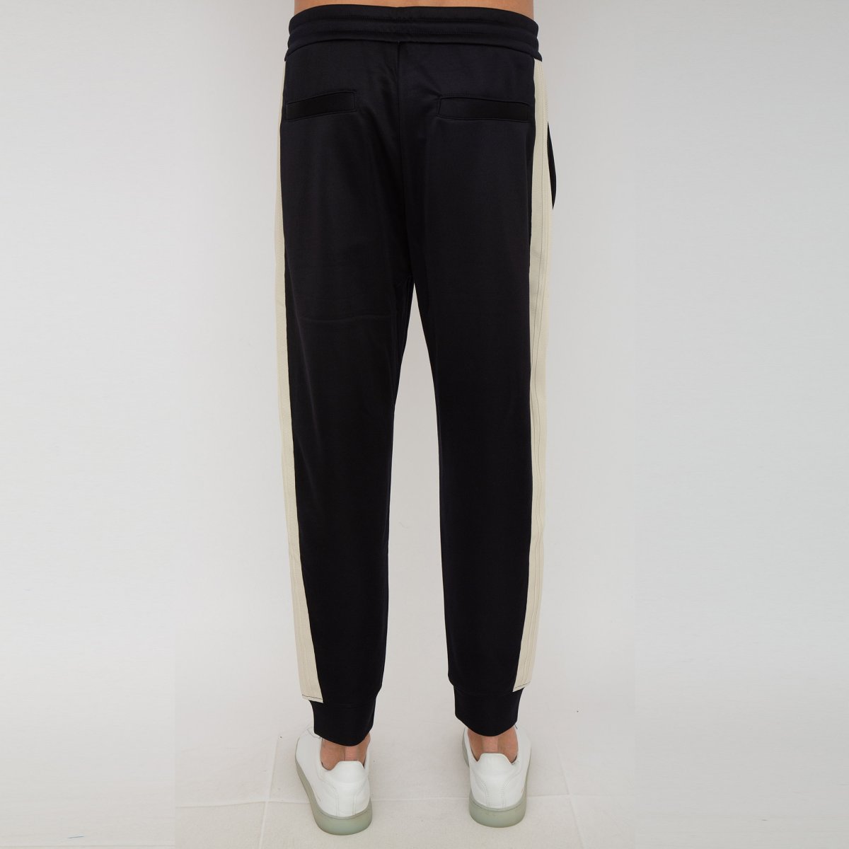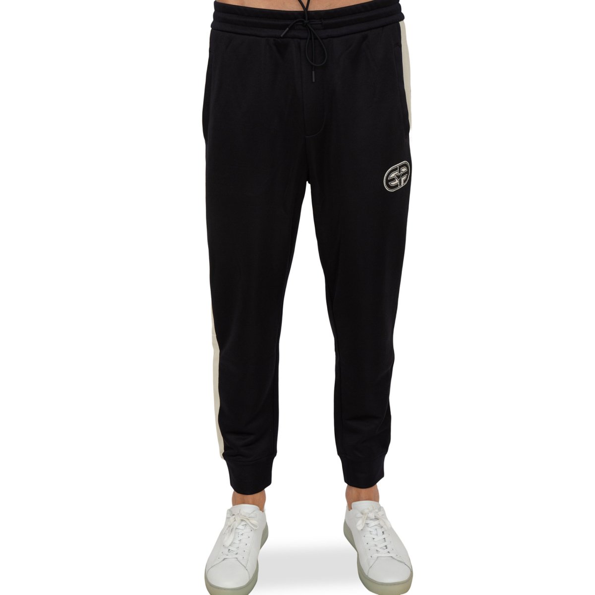 Pantaloni sportivi con applicazione, misto cotone, applicazione frontale con logo, vita con coulisse, due tasche a filetto laterali, due tasche posteriori a filetto e polsini elasticizzati.