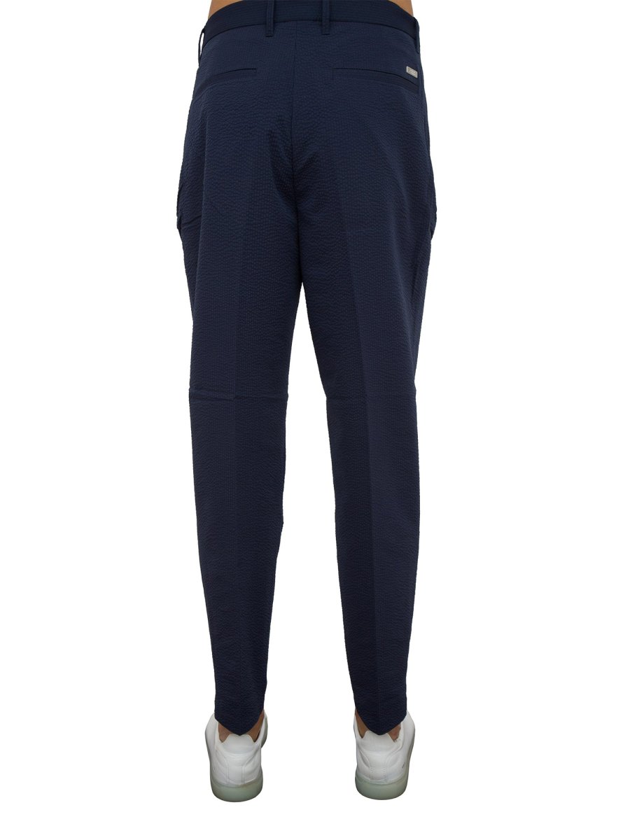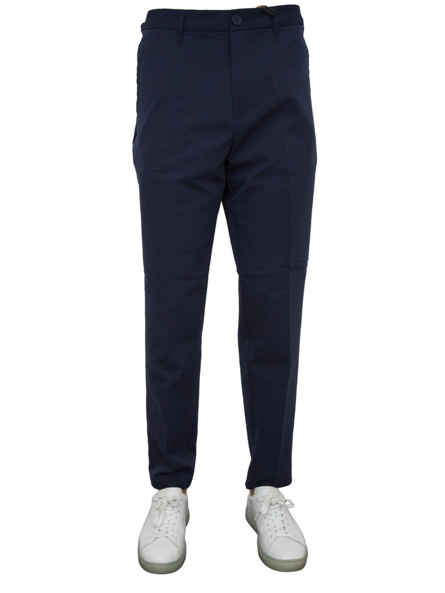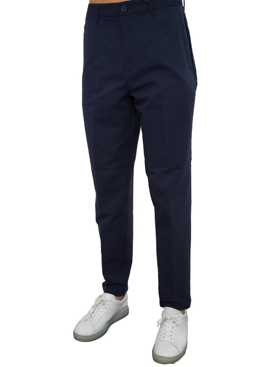 Pantaloni regular fit dal taglio classico realizzati in seersucker. Il modello presenta quindi con zip, tasche laterali e tasche posteriori.