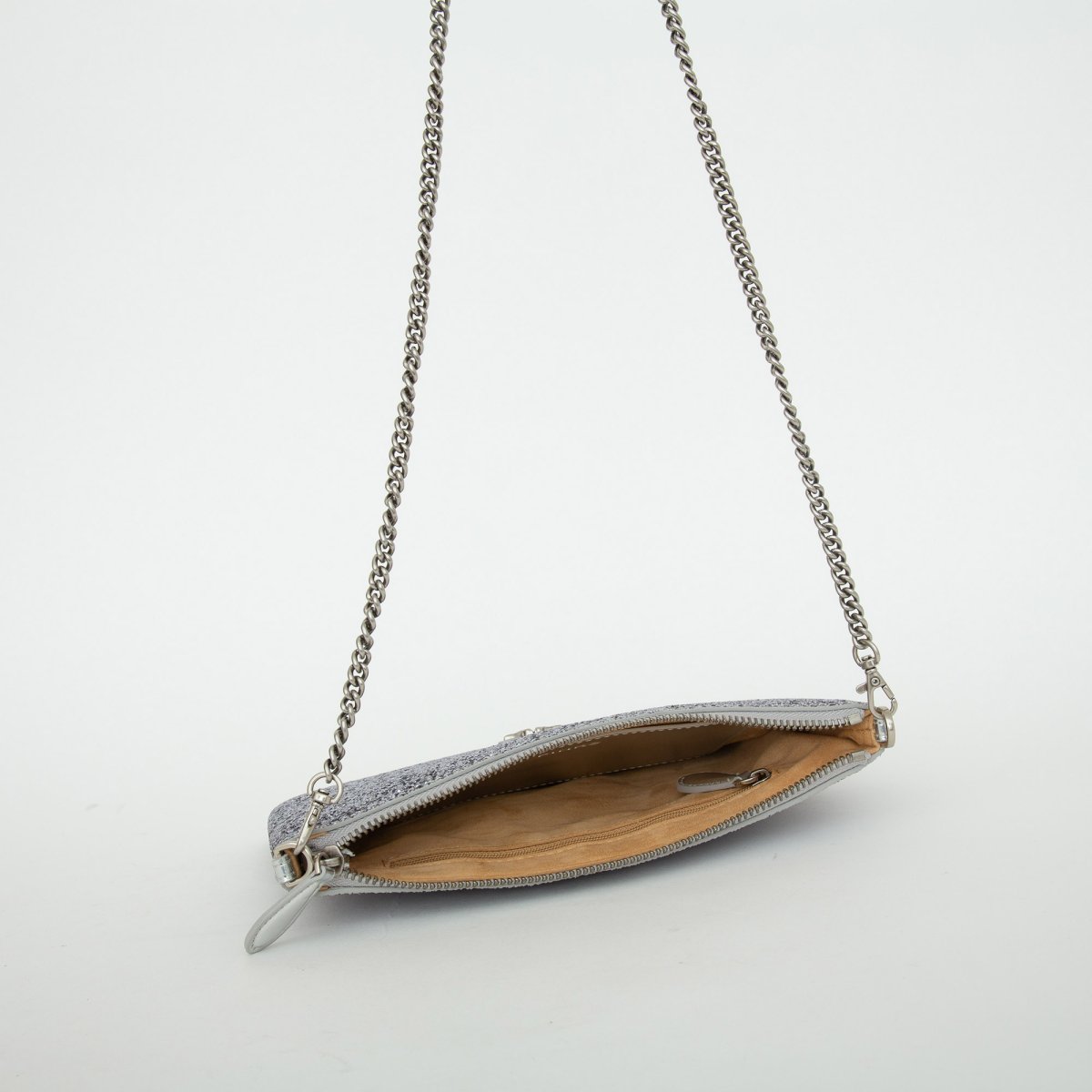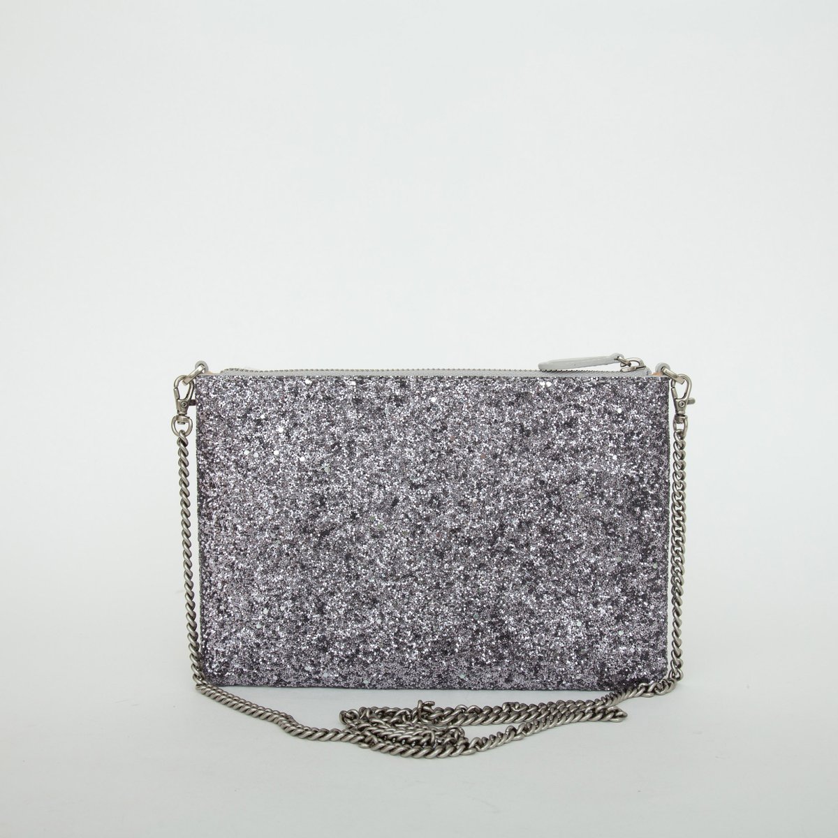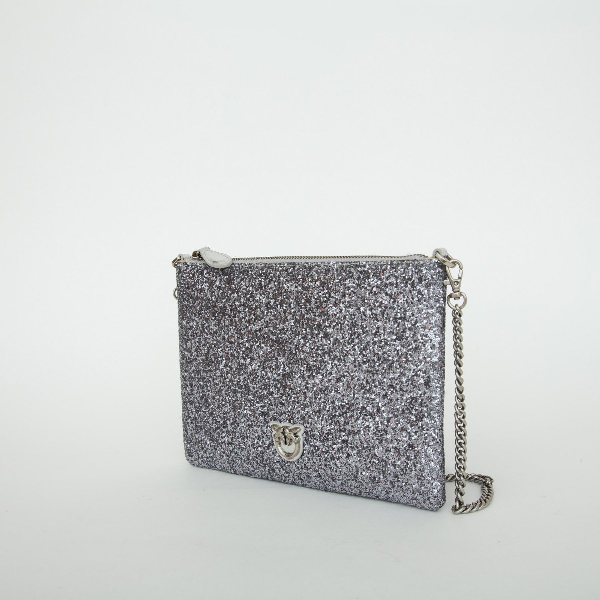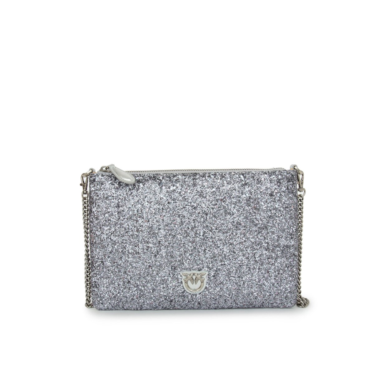 Borsa a tracolla flat dalla texture grainy glitter. Personalizzazione con placchetta Love Birds Diamond Cut. Interno foderato in polycotton e tracolla rimovibile a catena sottile. Chiusura con zip.