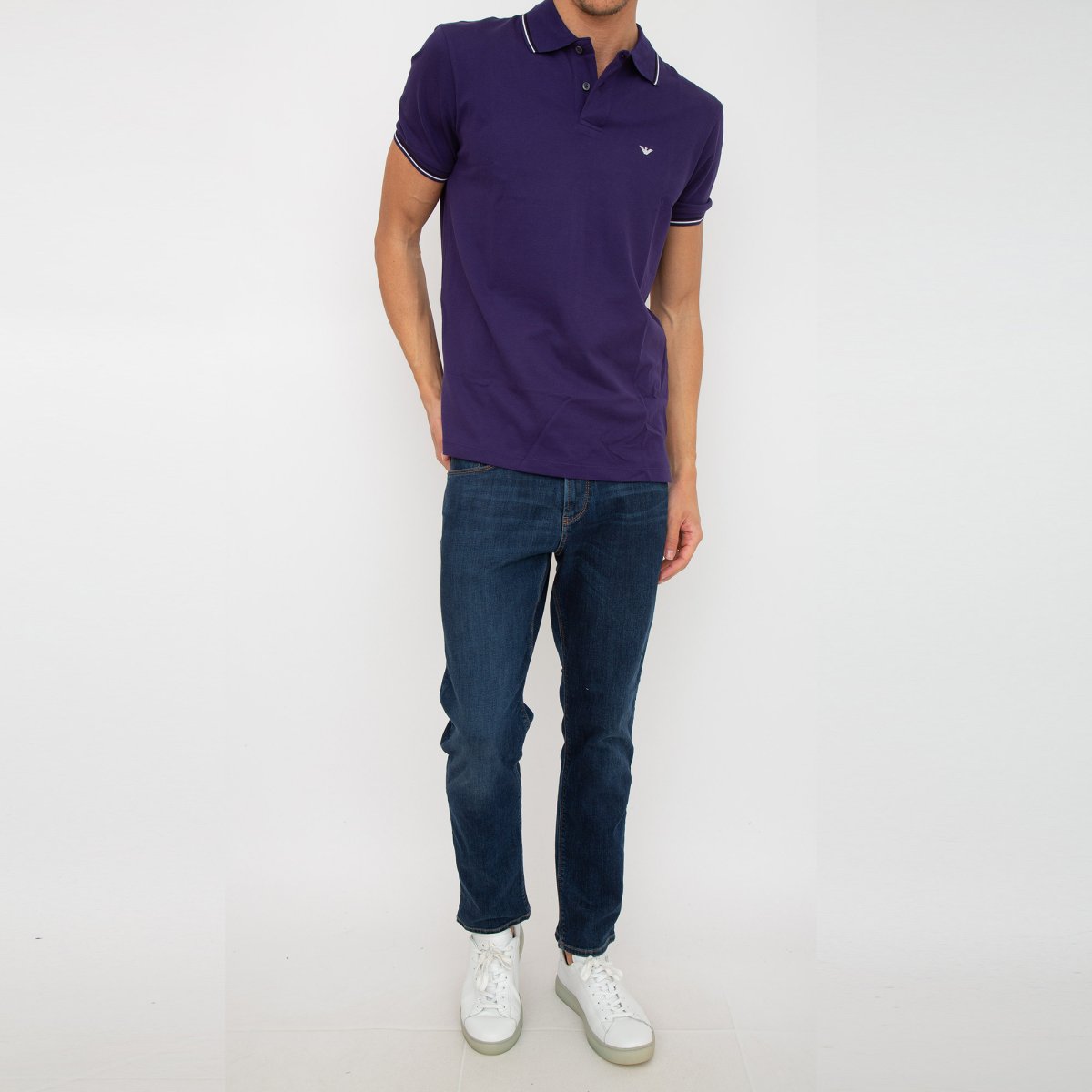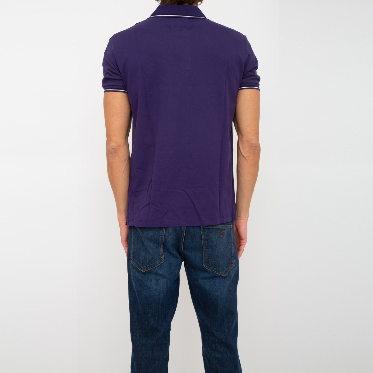 Polo con orlo a righe, logo ricamato sul petto, colletto stile polo, falsatura frontale con abbottonatura, maniche corte e orlo dritto.