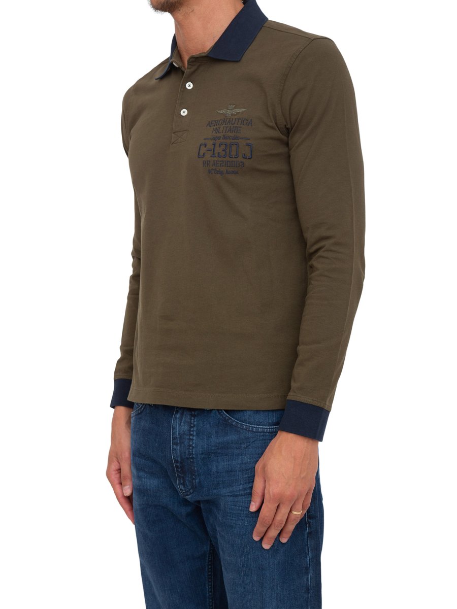 Polo A.M. a maniche lunghe in jersey di cotone caratterizzata da finiture in costina su collo e polsi a contrasto colore e dal sobrio ricamo sul petto sinistro che celebra il velivolo C-130J.