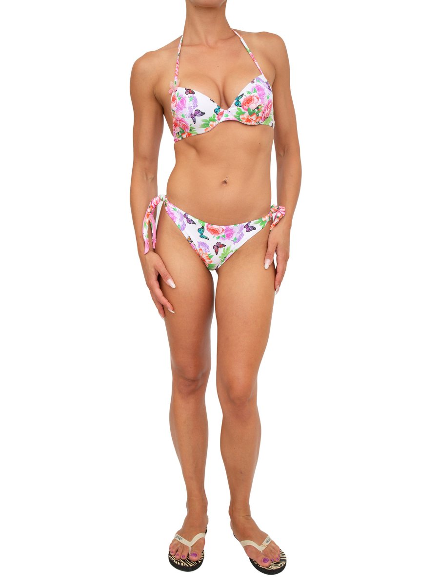 Top bikini con fantasia farfalle e fiori. E' regolabile grazie ai laccetti e le coppe removibili avvolgeranno delicatamente le tue forme. Farfalla applicata sullo scollo.