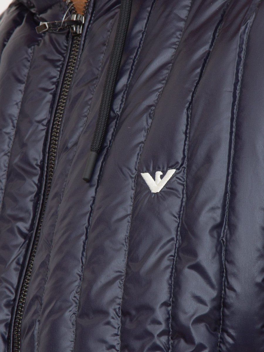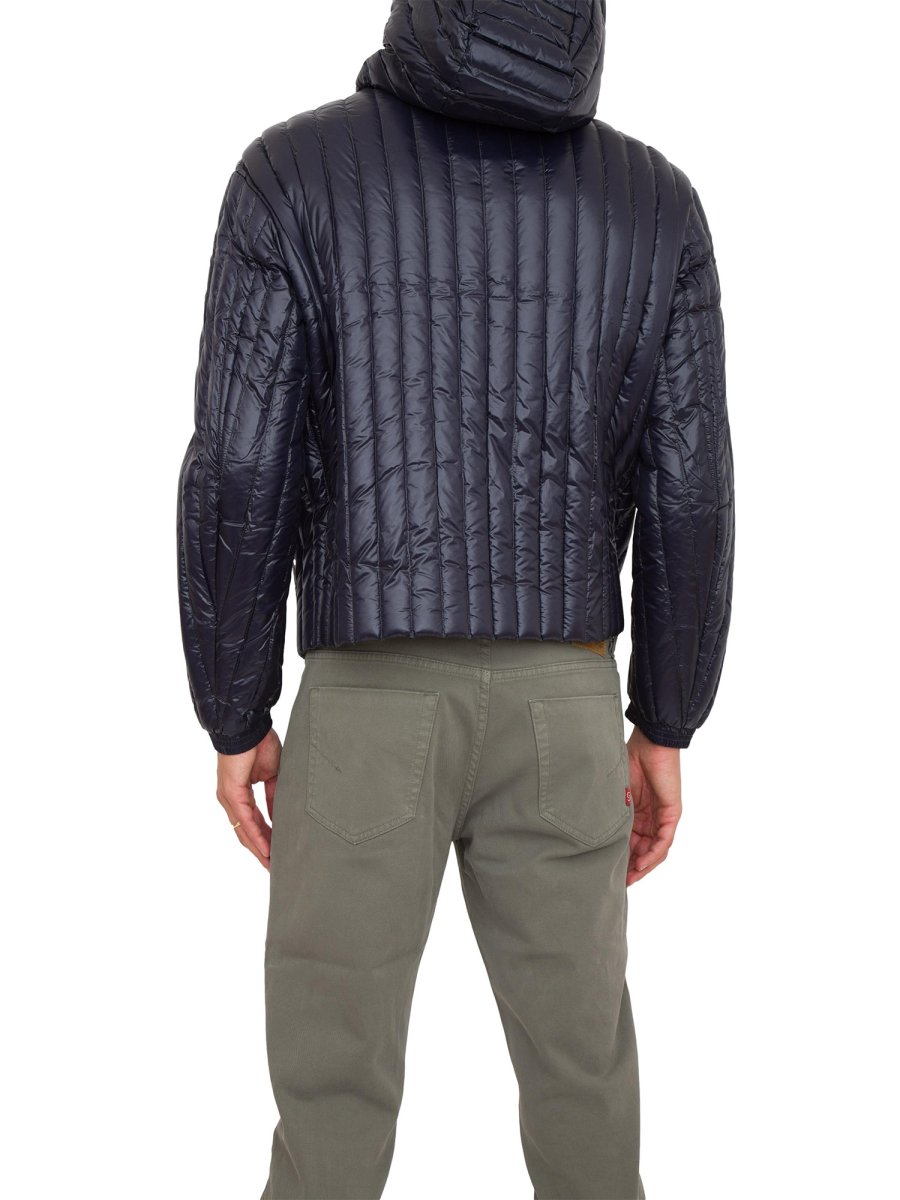 Piumino EMPORIO ARMANI realizzato in nylon a trapuntatura verticale. Provvisto di cappuccio con coulisse e chiusura con zip. Imbottitura in vera piuma.