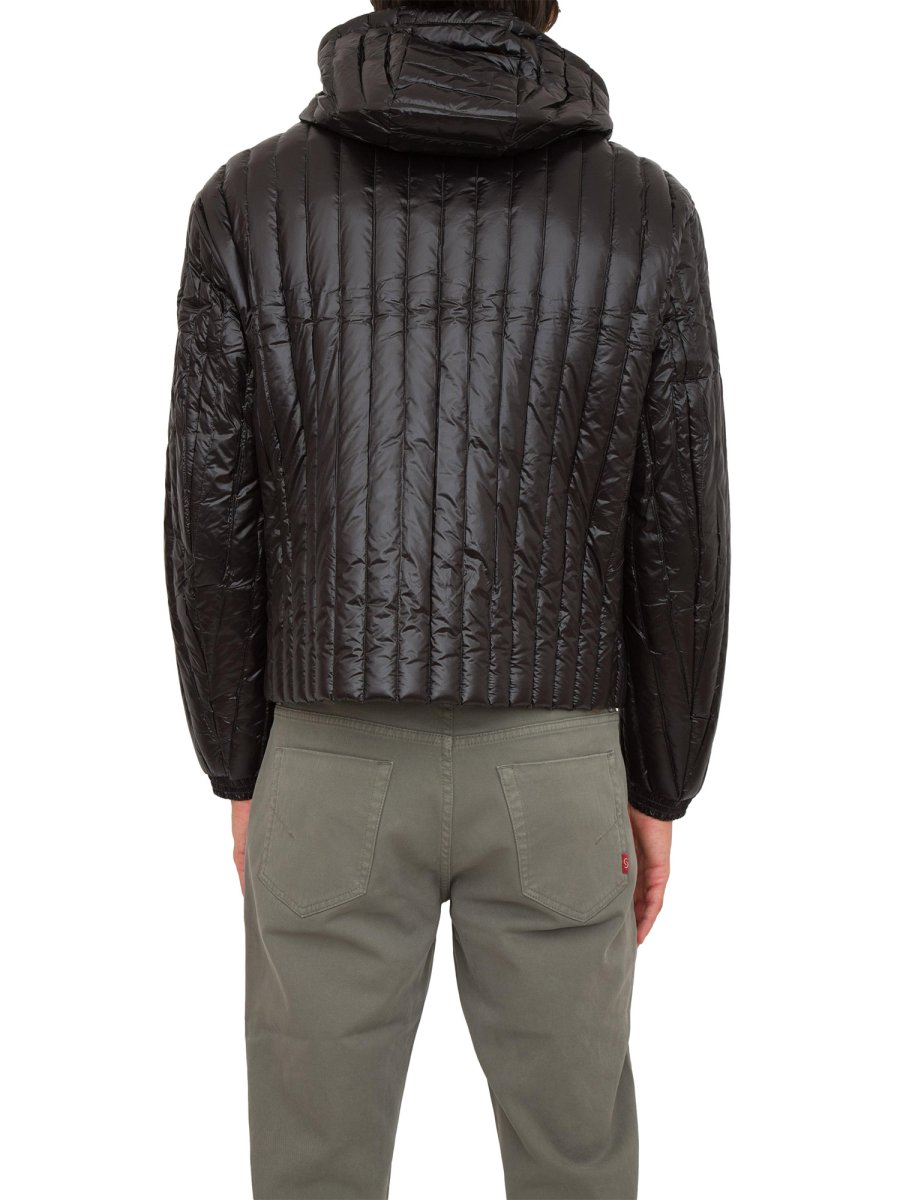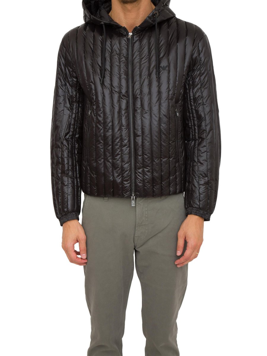 Piumino EMPORIO ARMANI realizzato in nylon a trapuntatura verticale. Provvisto di cappuccio con coulisse e chiusura con zip. Imbottitura in vera piuma.