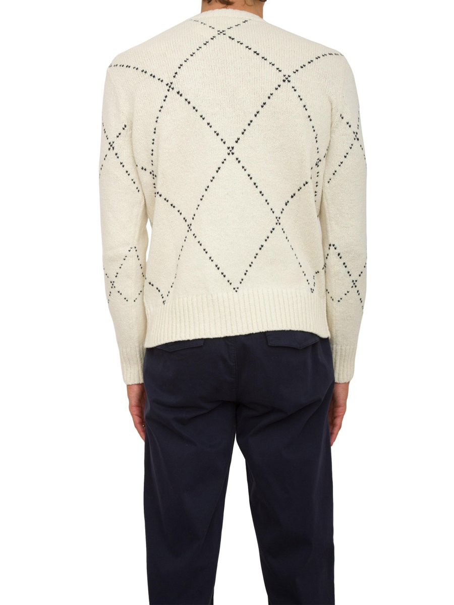Светр з круглим вирізом виготовлений із 100% вовняної пряжі Malfilè від Loro Piana. Ромбоподібний дизайн із пряжі контрастного кольору з ефектом швів характеризує цей одяг, чиї ребристі манжети, комір і низ надають йому відчуття спортивного шику.