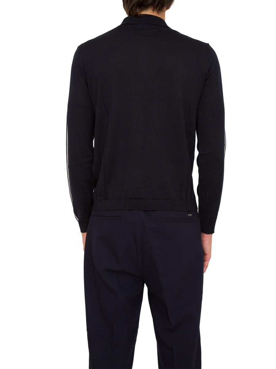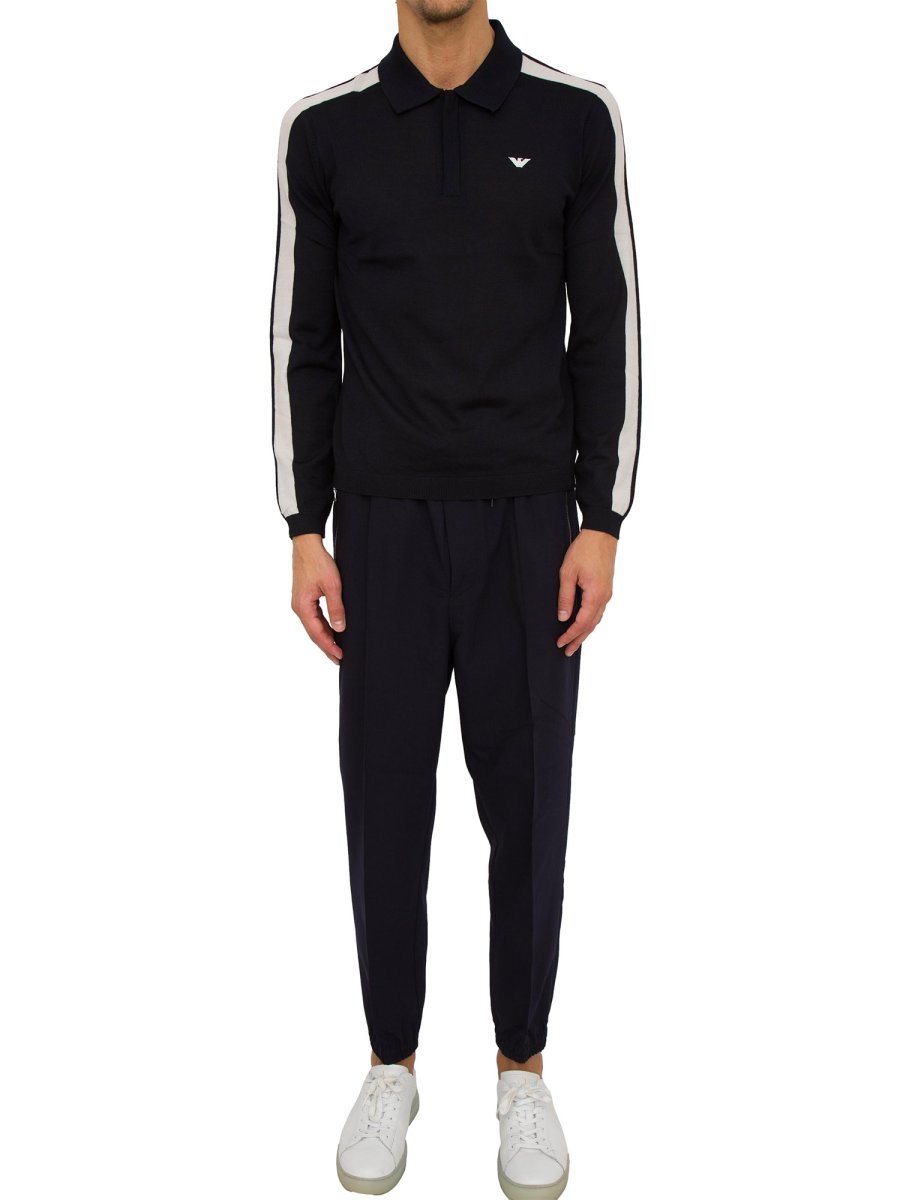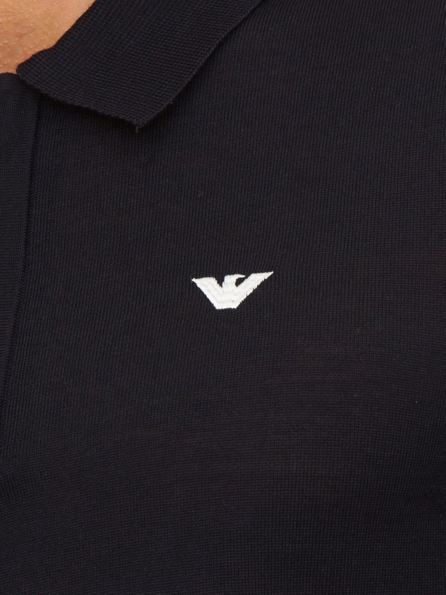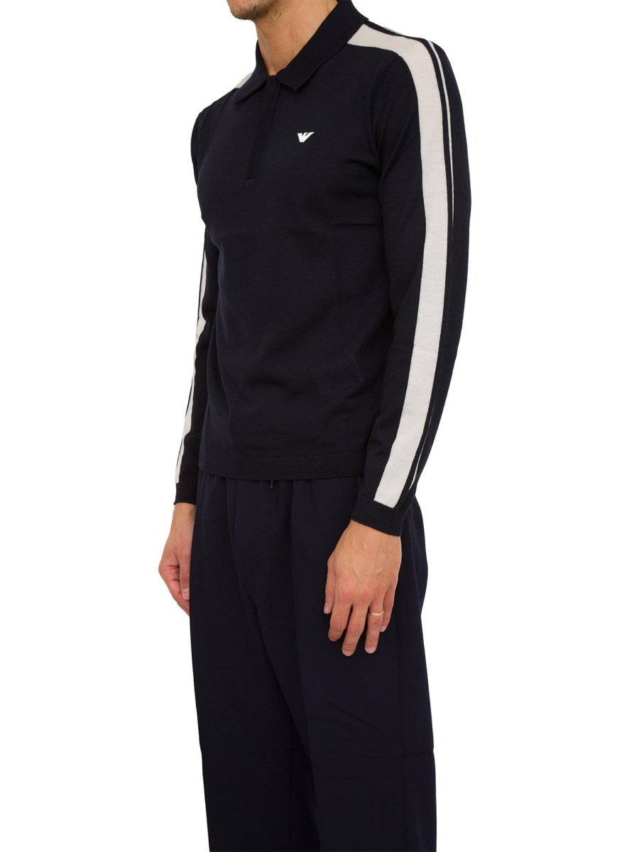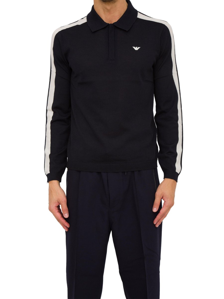 Polo in maglia da uomo Emporio Armani realizzata in lana, maniche lunghe, collo classico, mini logo iconico sul petto e profili a costine.