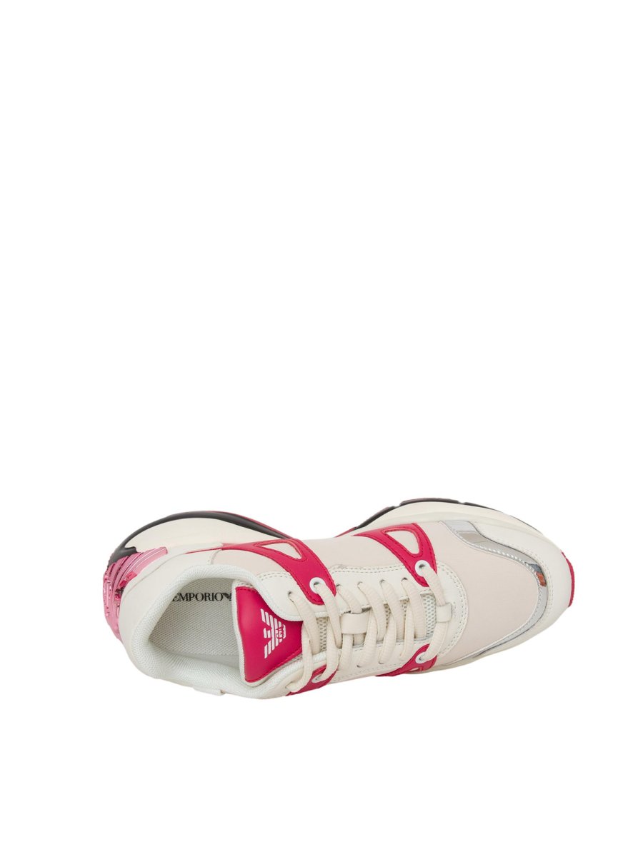 Sneakers da donna Emporio Armani realizzata in pelle di bovino, effetto laminato, brand logo, stringhe, punta tonda, interno foderato e suola in gomma.