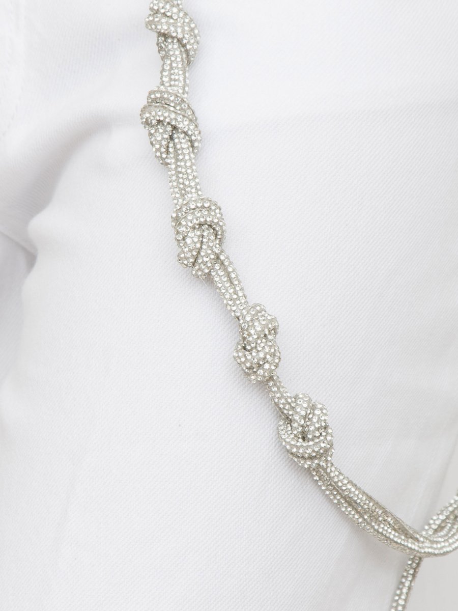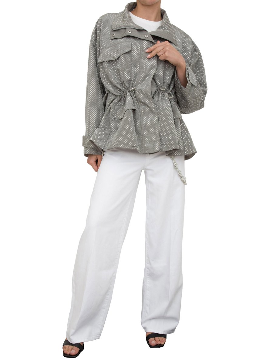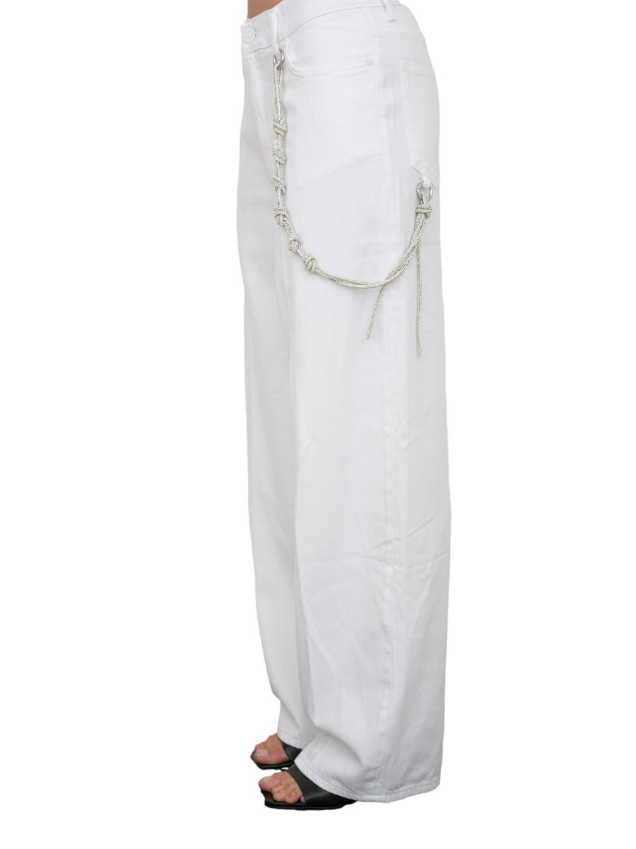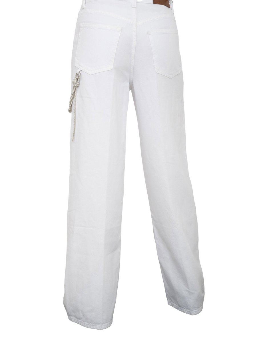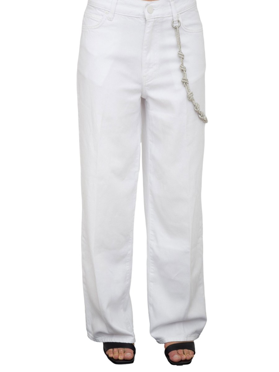 Женские брюки Pinko с пятью карманами из свободного хлопкового полотна, легкие и струящиеся на ощупь, с цепочкой с драгоценными камнями сбоку. Свободный крой с широкими, удлиненными штанинами, низким шаговым швом, застежкой на металлические кнопки и потайную молнию. Эти брюки являются символом городского стиля, в котором не обходят стороной гламурные и женственные детали.