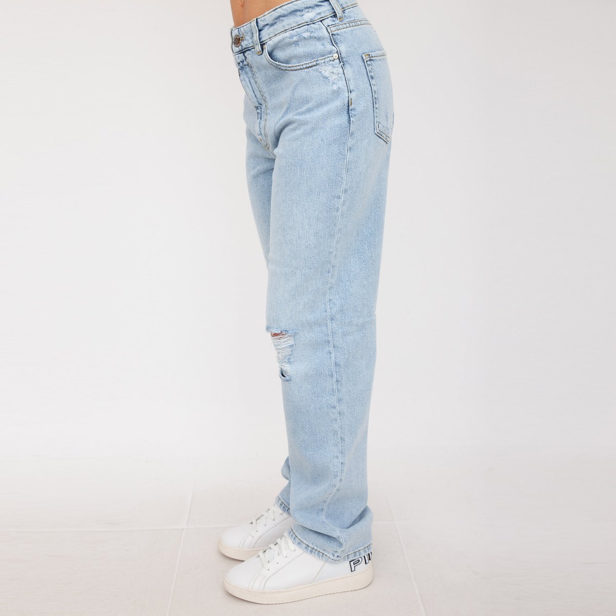 Jeans cinque tasche dalla silhouette boyfriend in denim con lavaggio marmorizzato e dettagli effetto used. Vita alta con passanti per cintura, gamba dalla linea relaxed con strappi sulle ginocchia. Chiusura con zip e bottone a chiodo in metallo.