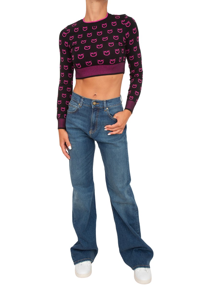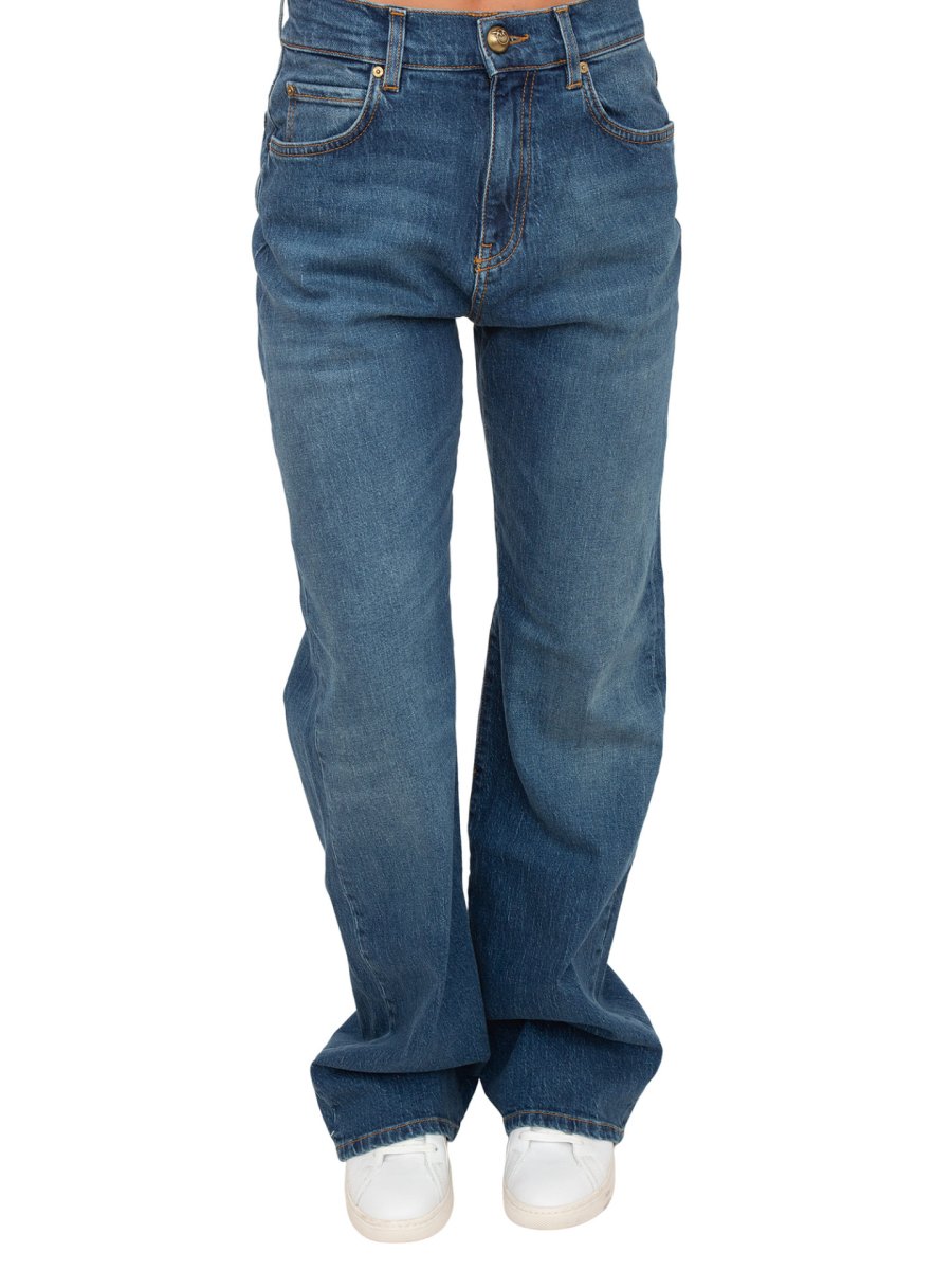 Jeans Pinko cinque tasche wide leg in denim comfort blue. Vita bassa con passanti per cintura e gamba dalla linea dritta, ampia e rilassata. Chiusura con zip e bottone a chiodo in metallo.
