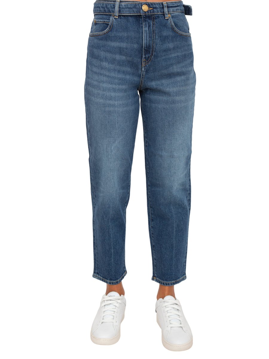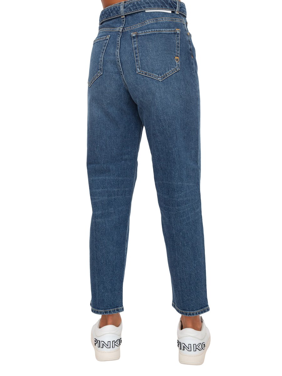 Jeans Pinko cinque tasche mom-fit in denim comfort vintage lavaggio medio scuro. Vita alta con passanti per cintura e dettaglio di cintura a fusciacca da infilare nei passanti oppure da lasciar cadere lunga su un fianco. Gamba dalla linea dritta, leggermente più stretta al fondo. Chiusura con zip e bottone a chiodo in metallo.