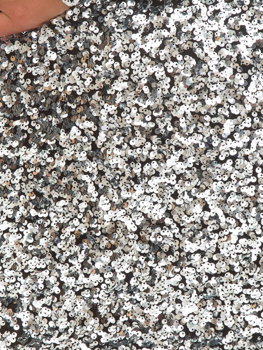 Miniabito Patrizia Pepe in paillettes con scollo a V, maniche lunghe, design aderente, lunghezza sopra il ginocchio e orlo dritto.