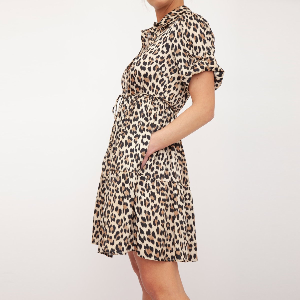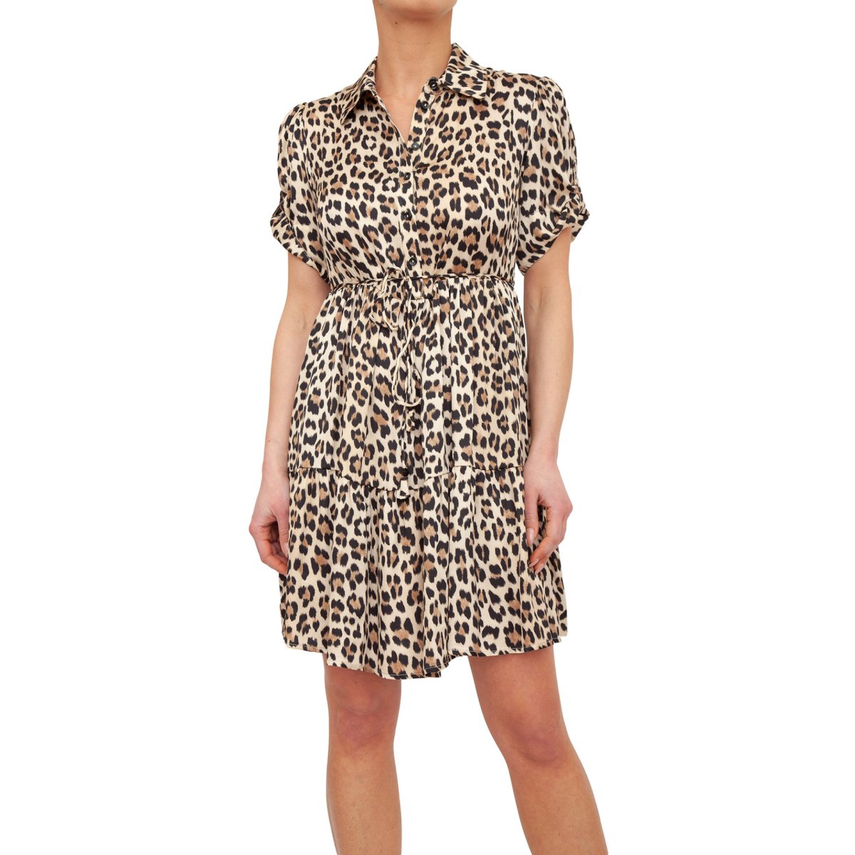 Abito corto in raso di viscosa con colletto, cintura abbinata, linea morbida e apertura con bottoni.