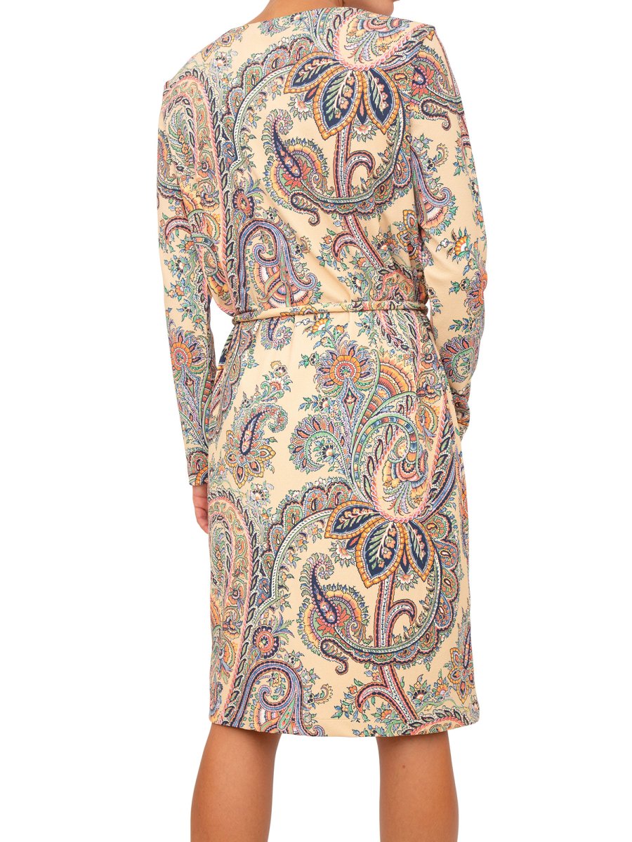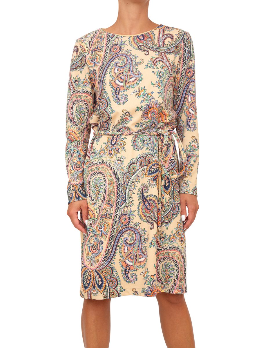Abito donna Etro con stampa paisley, jersey elasticizzato, scollo rotondo, maniche lunghe, nodo in vita, orlo dritto e lunghezza al ginocchio.