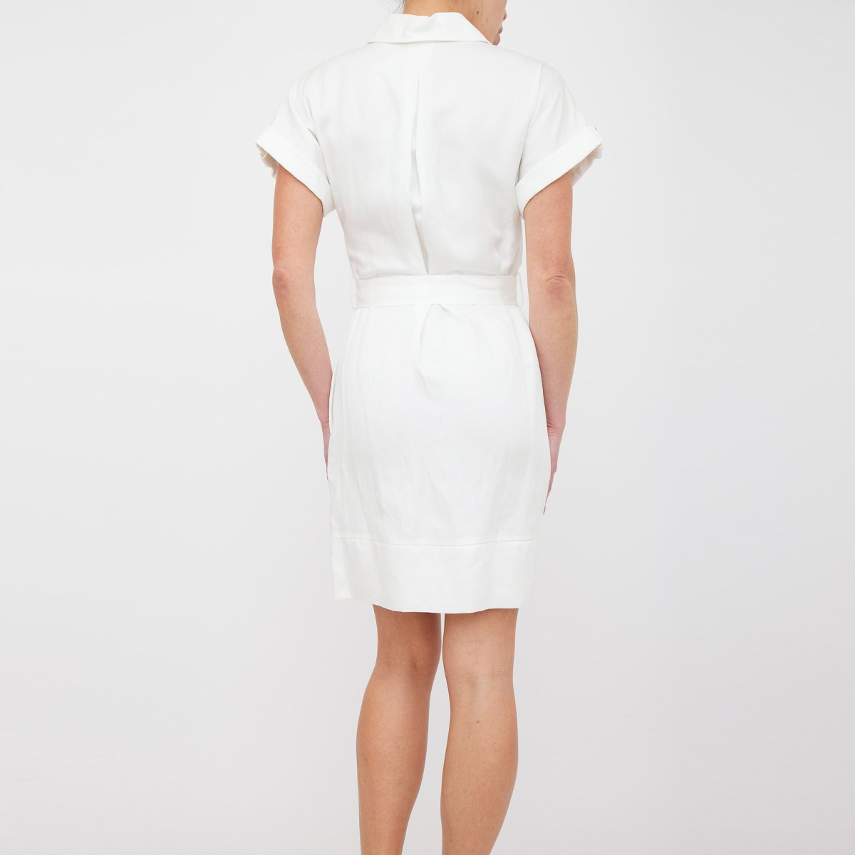 Abito in misto lino, modello chemisier, manica corta, vestibilità regular e chiusura con bottoni.