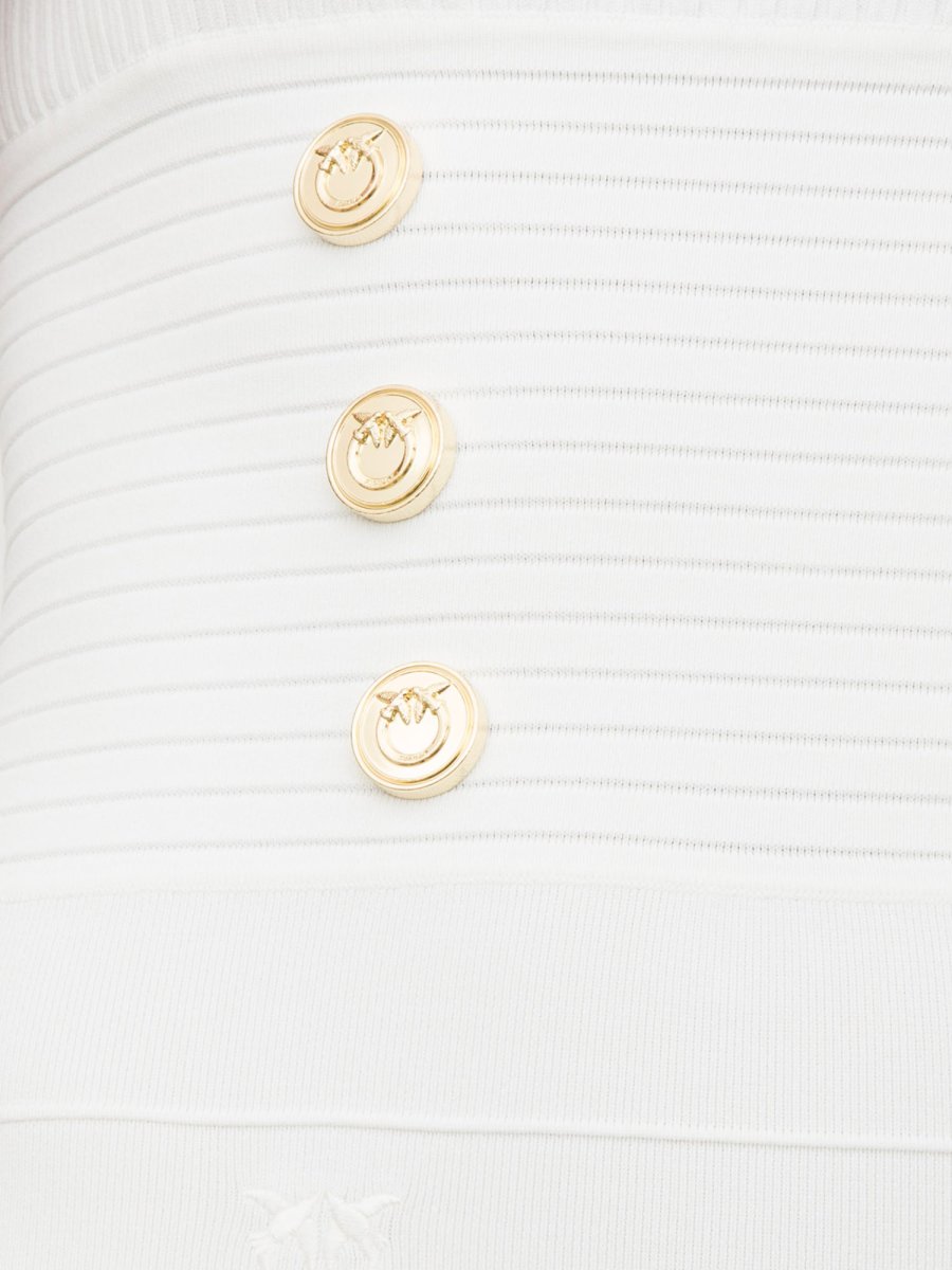 Abito corto senza maniche in maglia di misto viscosa jacquard lavorata a bande orizzontali, personalizzate con ricamo logo Love Birds. Linea aderente con spalline, ampio scollo sia davanti che sul retro e dettaglio di bottoni in metallo applicati davanti. Chiusura con zip in metallo nel centro dietro.