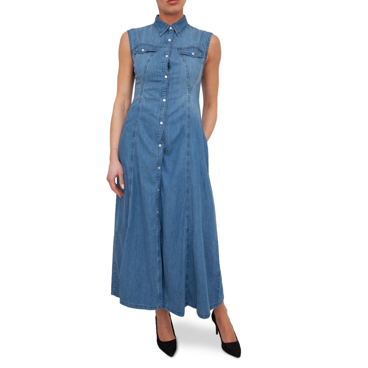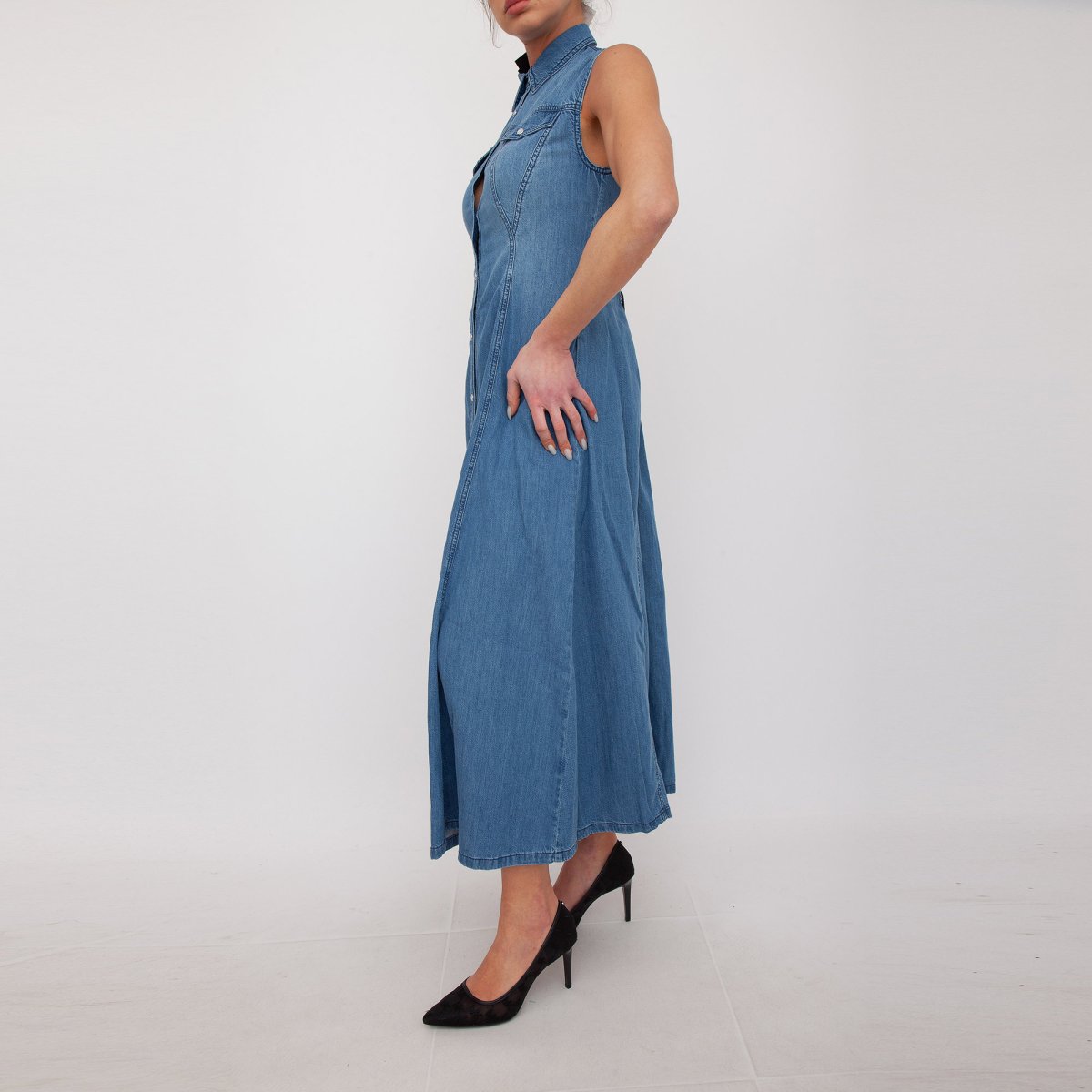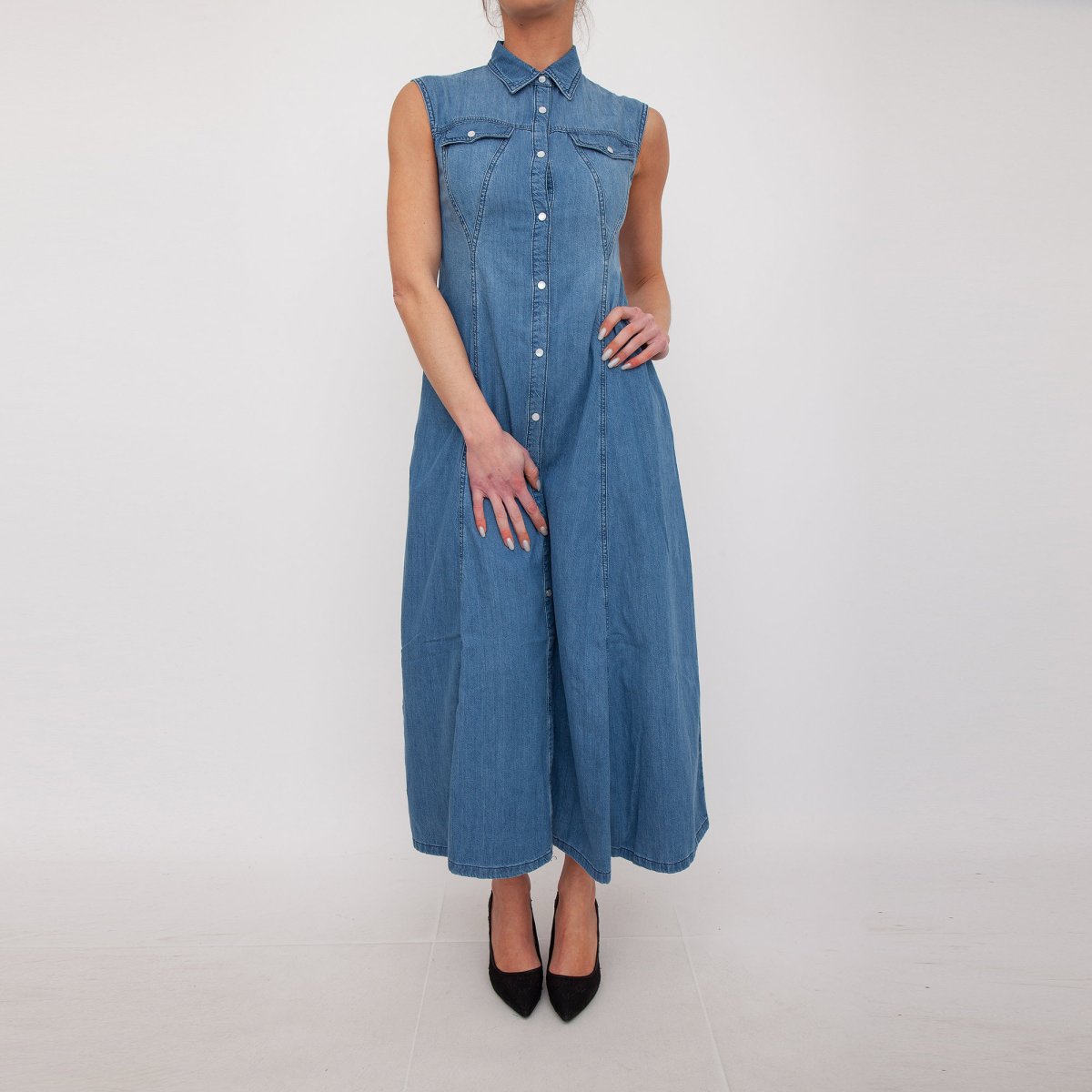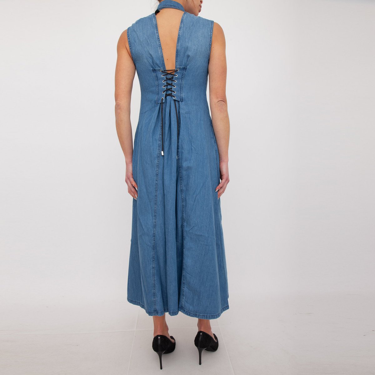 Abito lungo senza maniche in denim fluido, dalla particolare mano leggera e morbida. Colletto a camicia, taschini con patta e schiena scoperta con dettaglio di stringhe stile bustier. Chiusura con bottoni a pressione davanti.