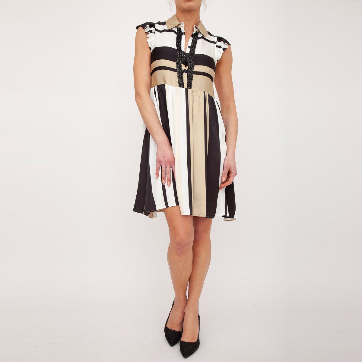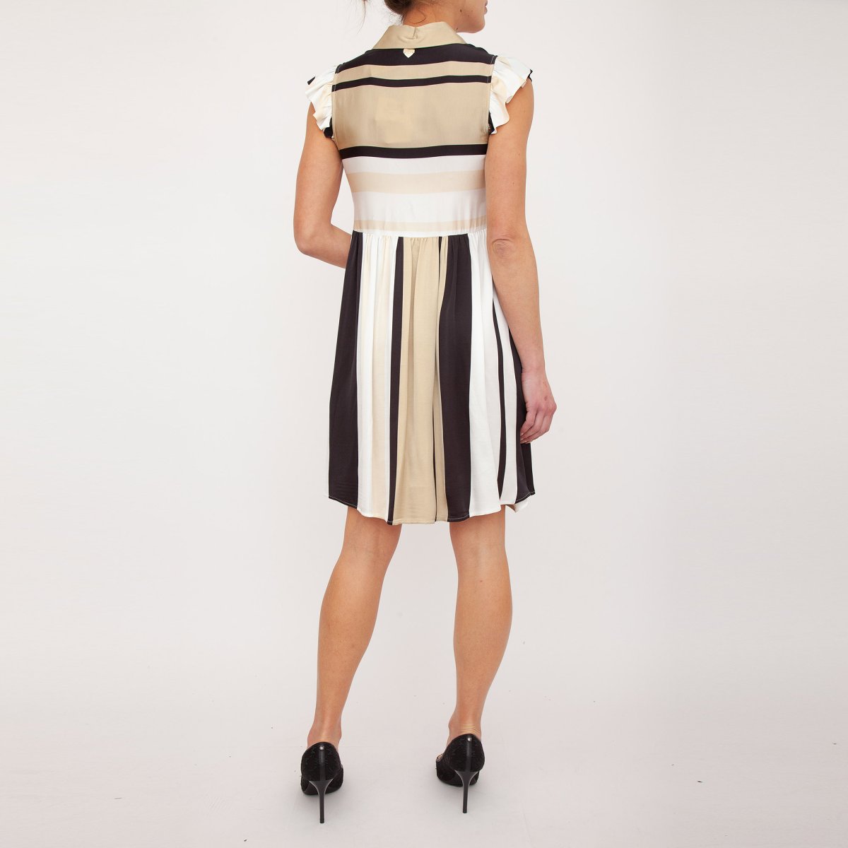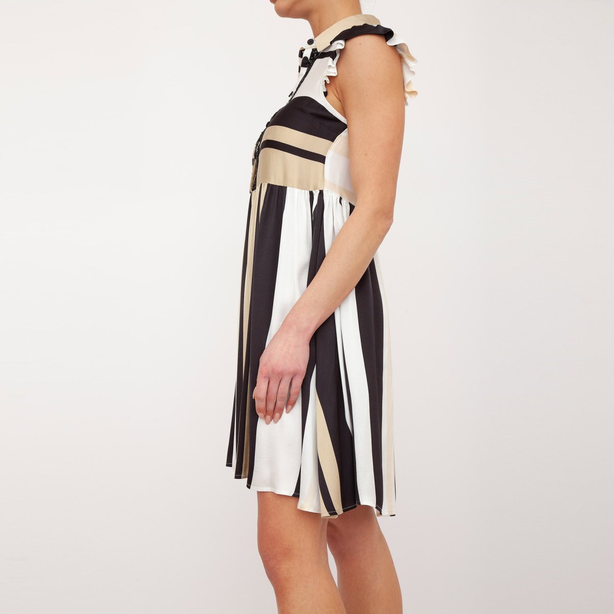 Abito corto in satin di viscosa stampato a righe multicolor con apertura rifinita da passamaneria di paillettes. Linea leggermente svasata, il colletto a camicia, l’apertura con bottoni ricoperti, il taglio in vita con arricciature e le maniche ad aletta.