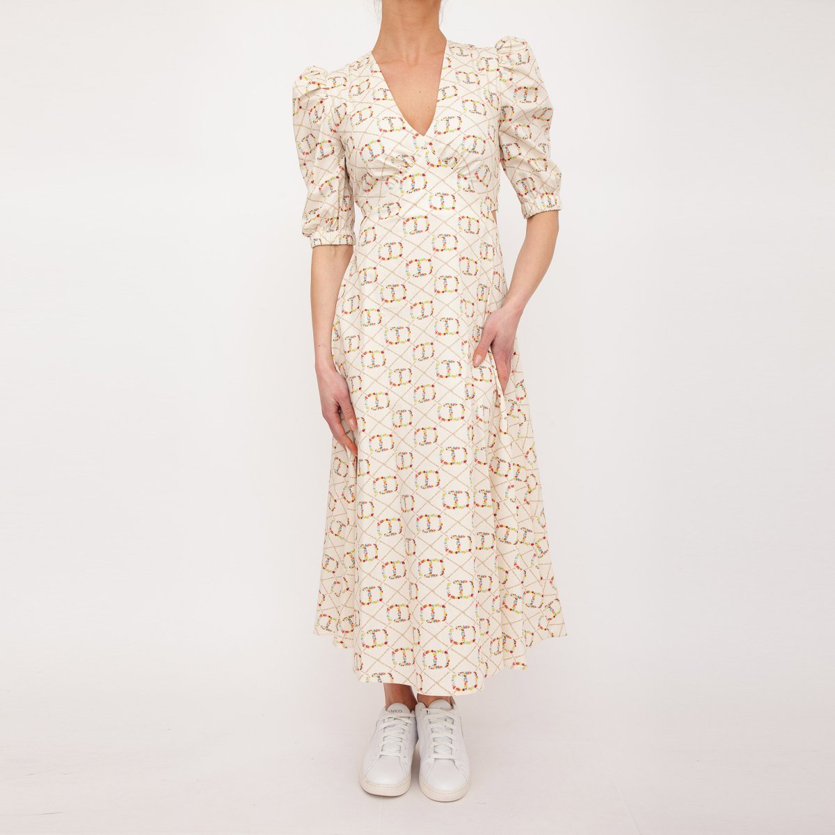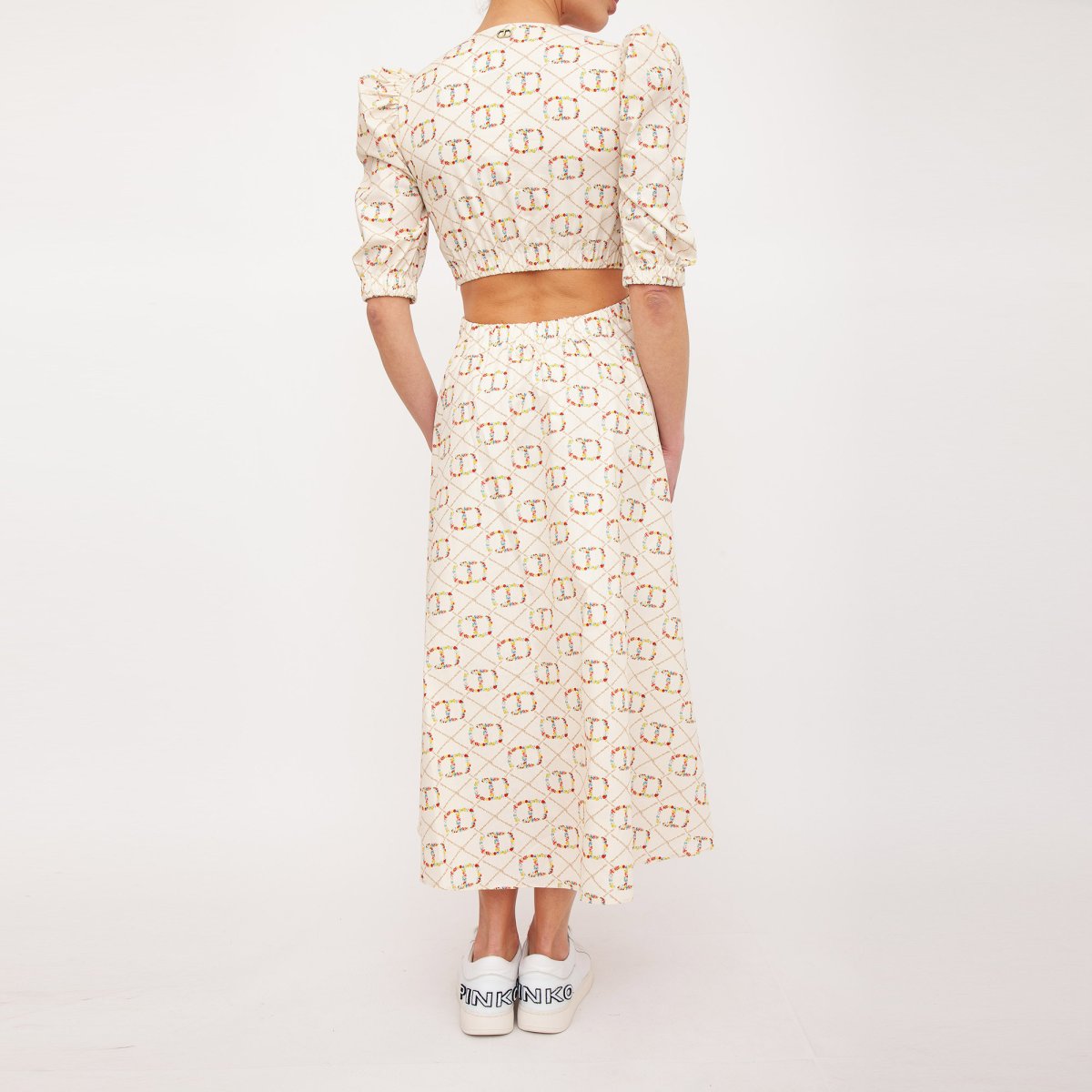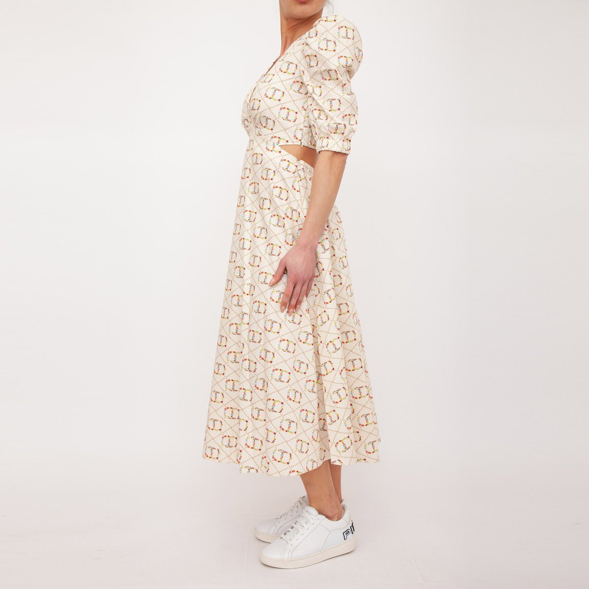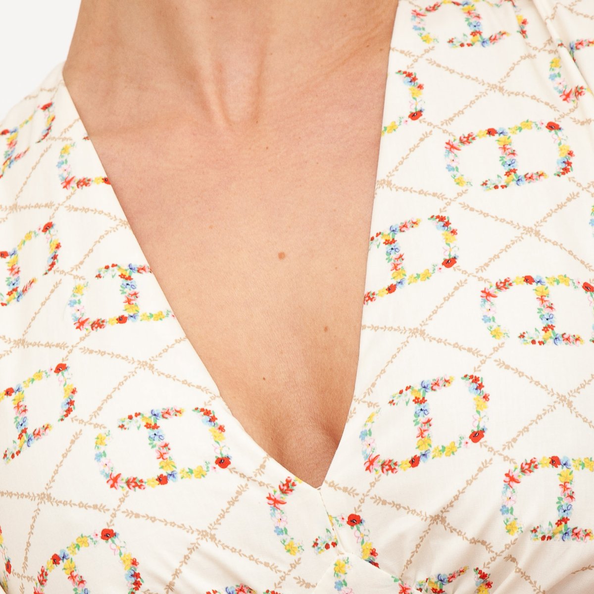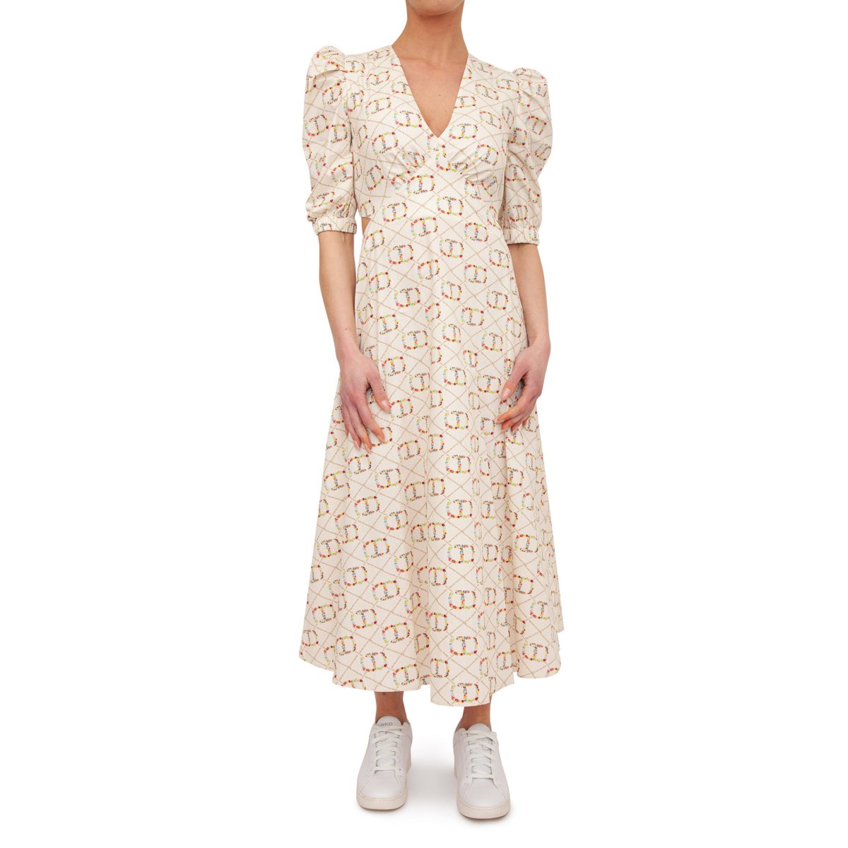 Abito longuette in popeline di cotone con stampa logo Oval T all over multicolor, scollatura a V, zip al fianco.