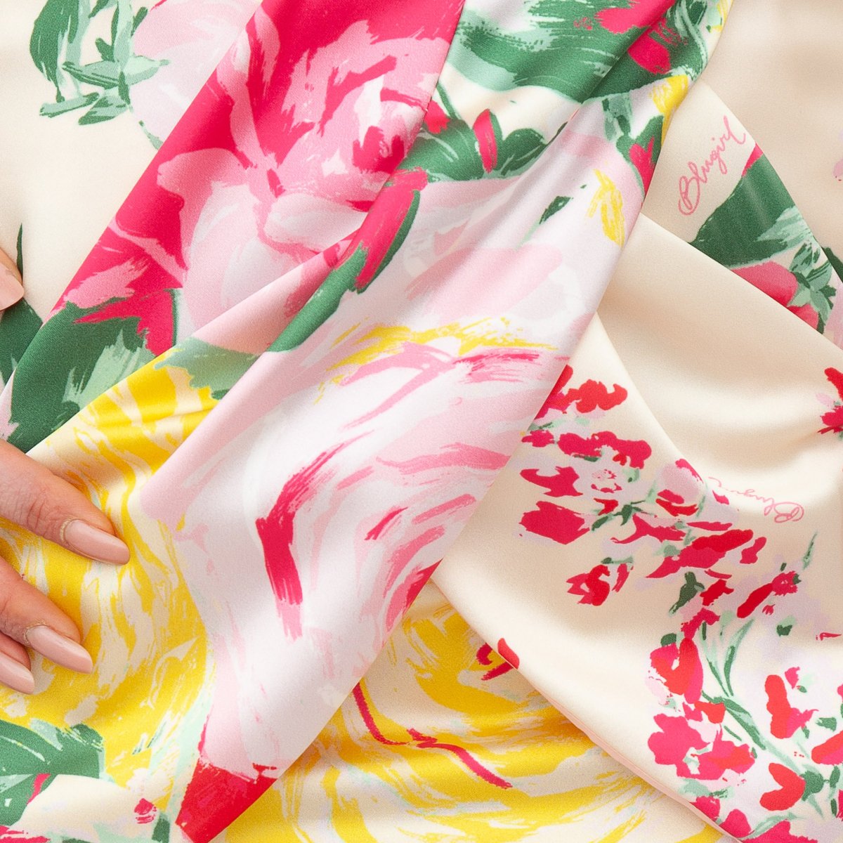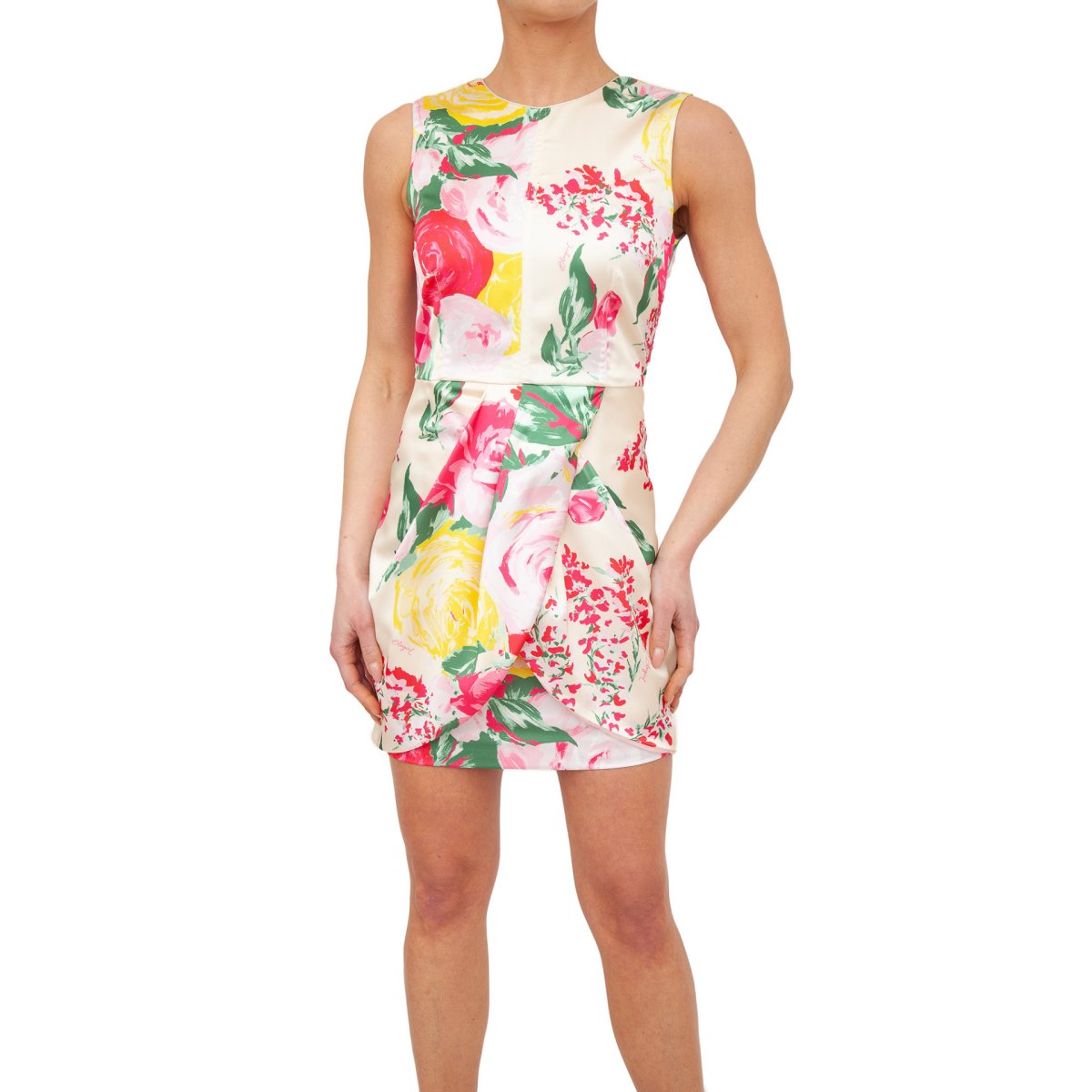Abito multicolore, scollo rotondo, senza maniche, stampa con rose, vita aderente, chiusura posteriore nascosta e orlo dritto.